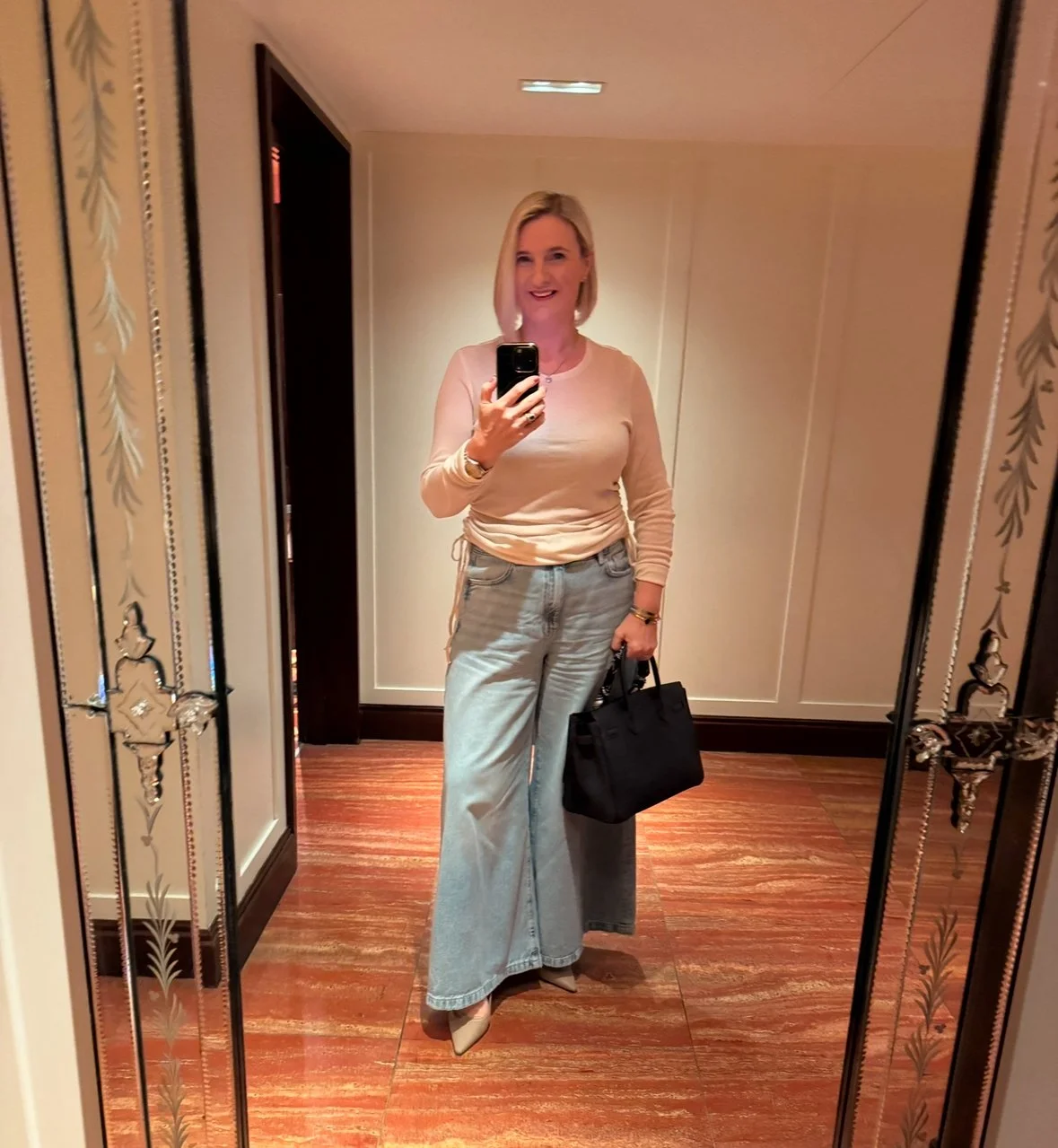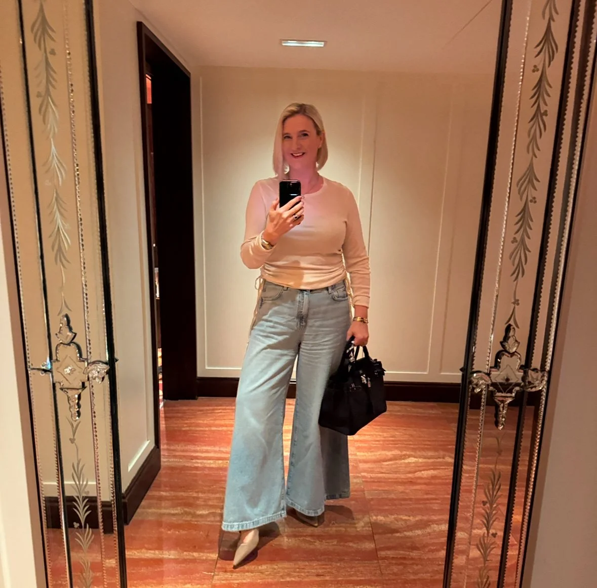 Top and Jeans from M&S, Shoes from Dior, Coat from Max Mara