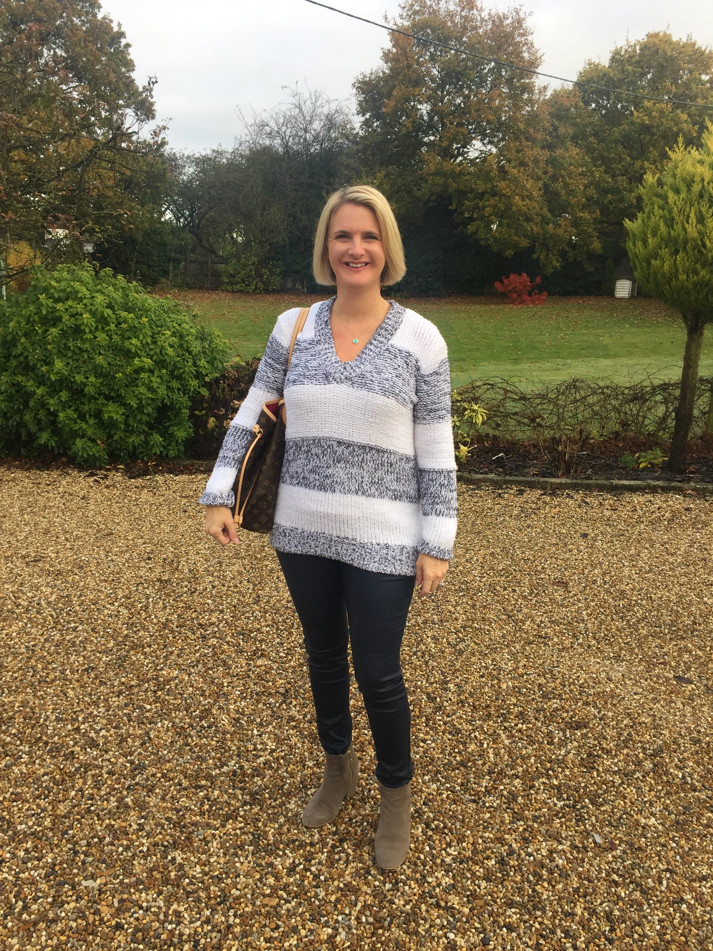Jumper from Michael Kors, leather look jeans from Next in navy, Boots from Phase Eight, bag from LV.