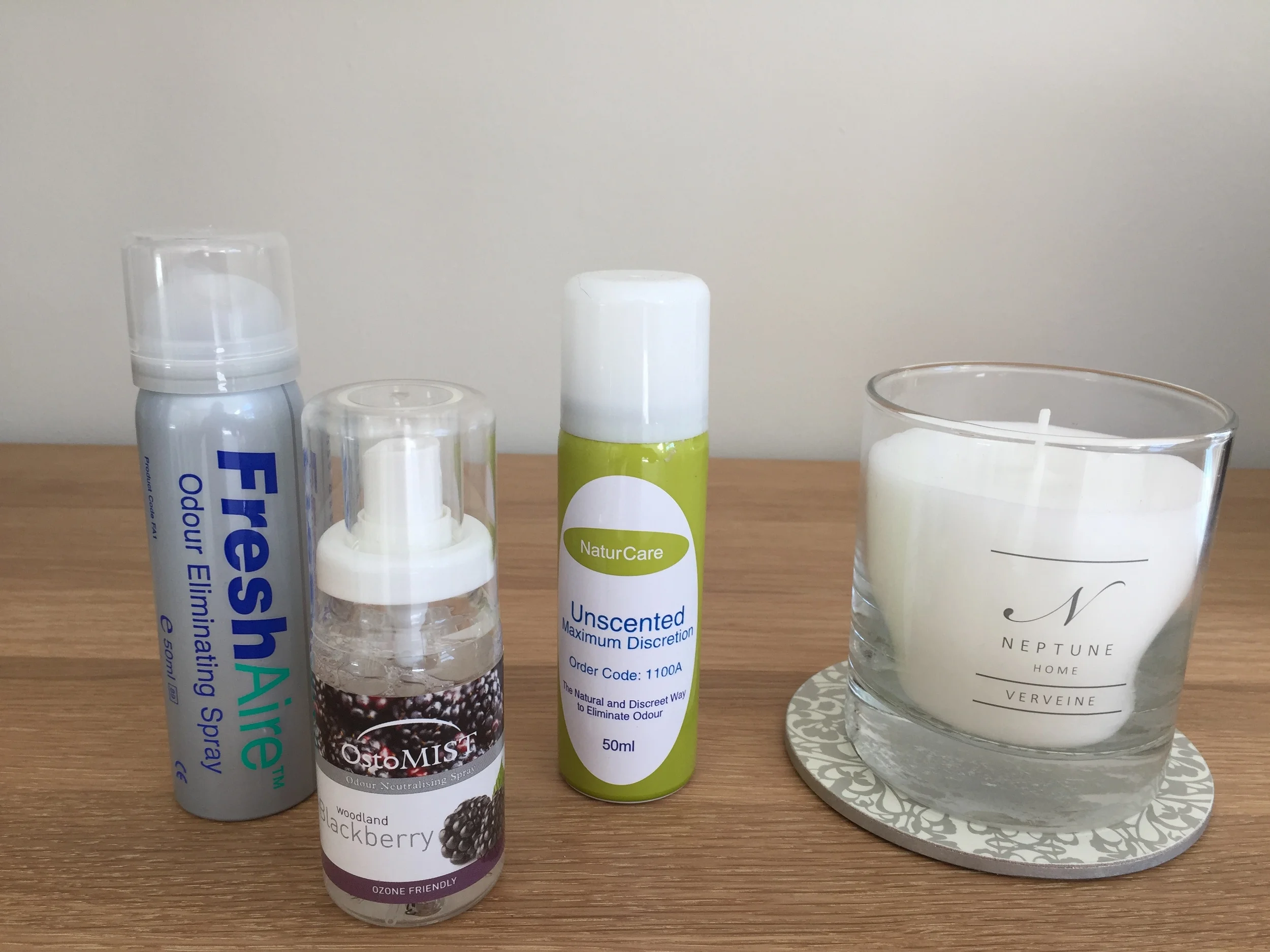 Your ostomy provider should be able to supply various room sprays, Candle from Neptune.com