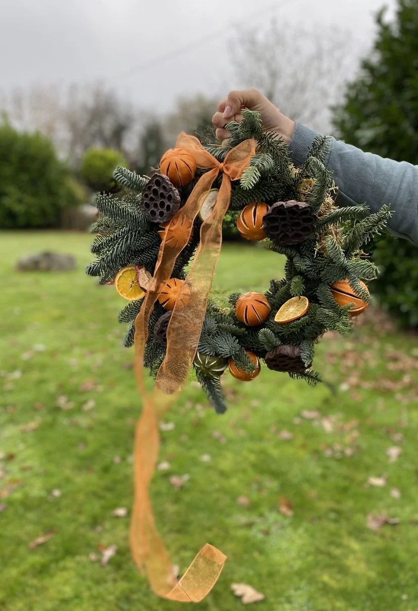 The ribbon colour made the wreath come alive! It was a spectacular choice to coordinate with the fruits.