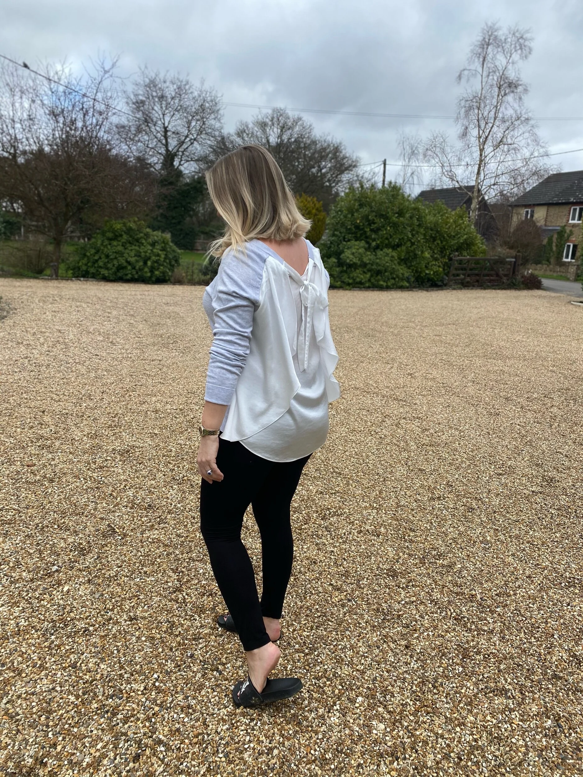 Top from Next, leggings from Tesco, Sliders from Topshop.