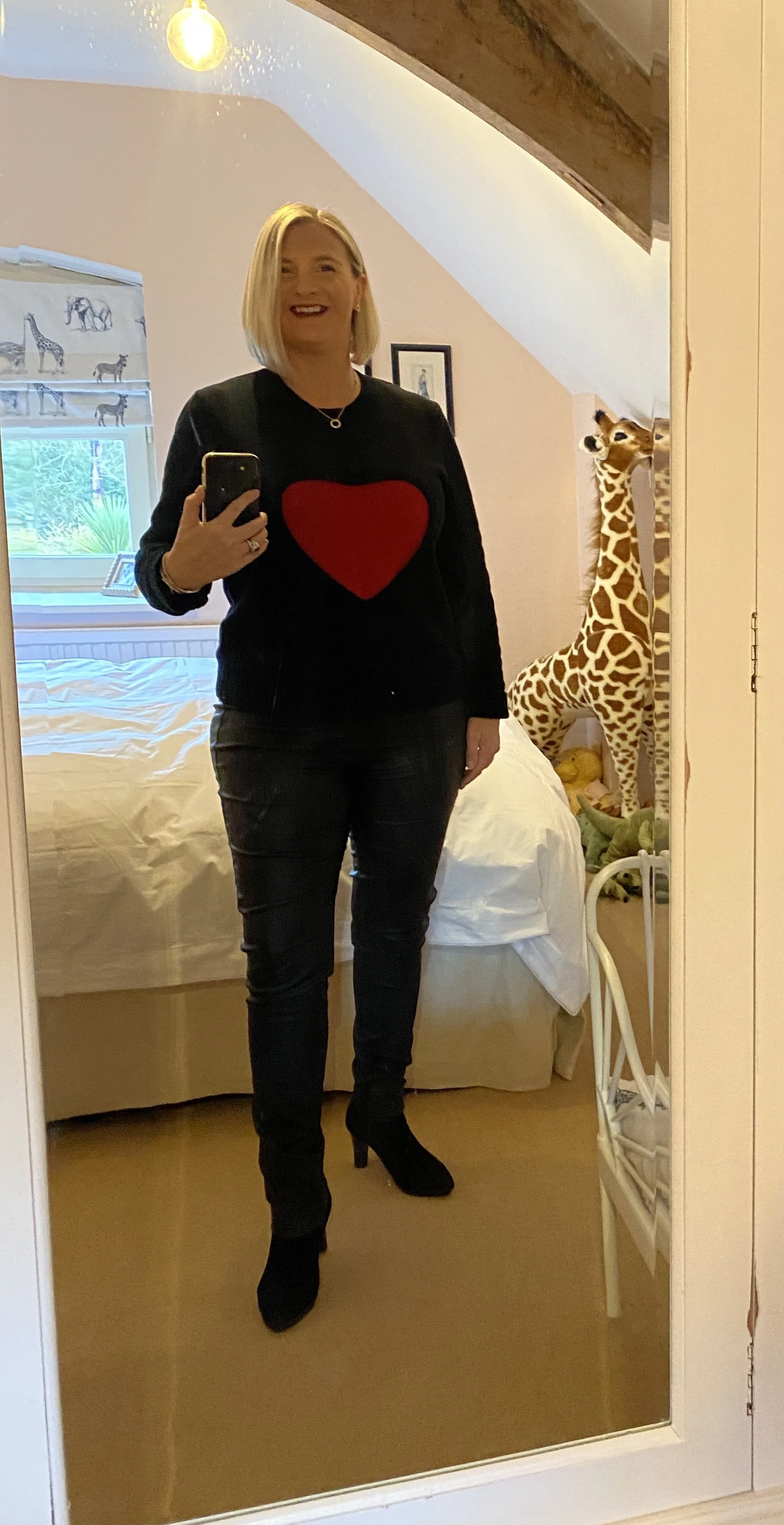 Valentine’s Day Jumper from Benetton, Trousers from Quiz, Boots from Russell and Bromley.