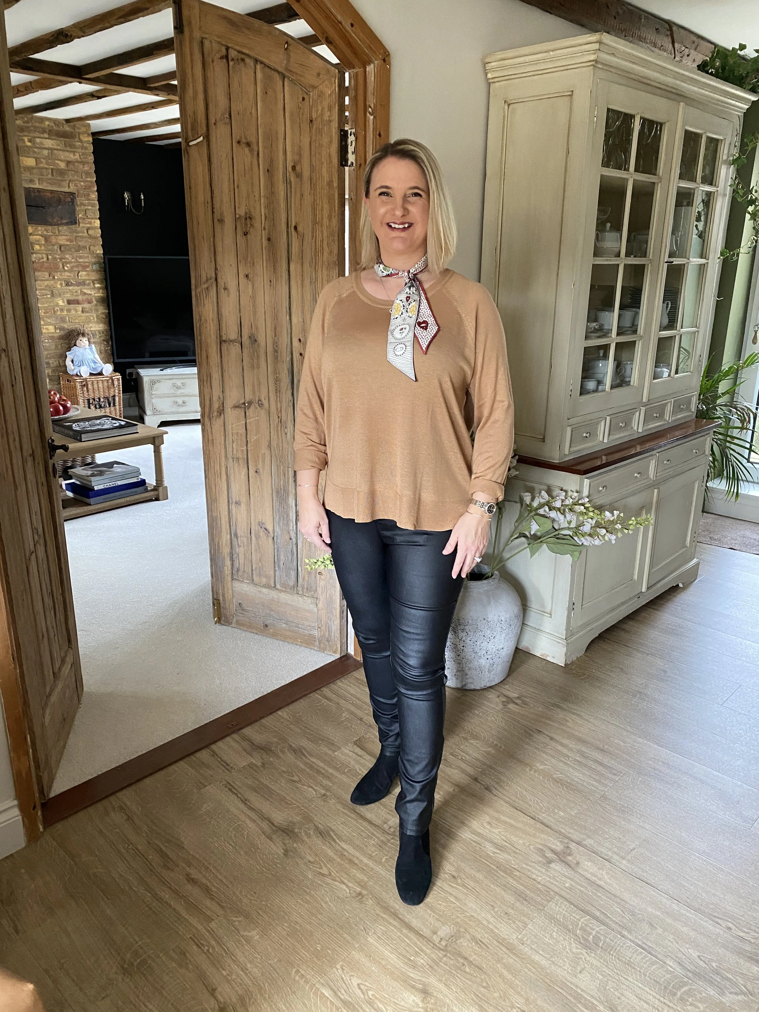 Jumper from Zara, Mitzah scarf from Christian Dior, Trousers from Quiz, Boots from Valentino Rockstuds, Coat from Holland Cooper.