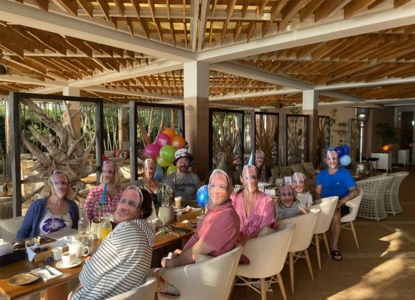 Catie had the genius idea of getting James’s face on face masks for us to greet him with at breakfast. (Apparently it’s very unnerving to turn up and see 11 of your own face staring back at you!).