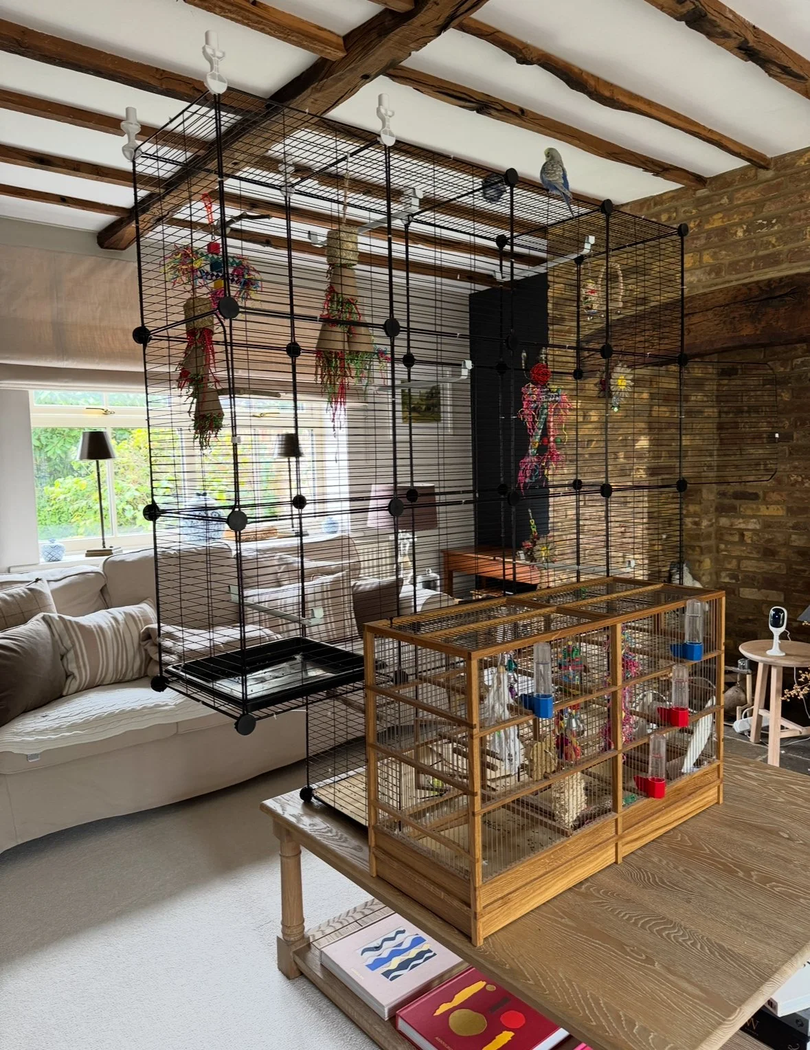 They have a nice cage for daily use, plus they fly around the living room when I’m here.
