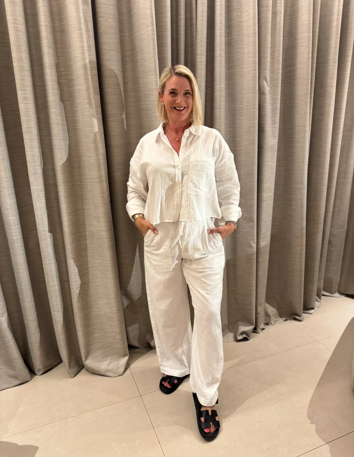Jacket and trousers from M&S, Vest top from Intimissimi, Shoes from Hermes.
