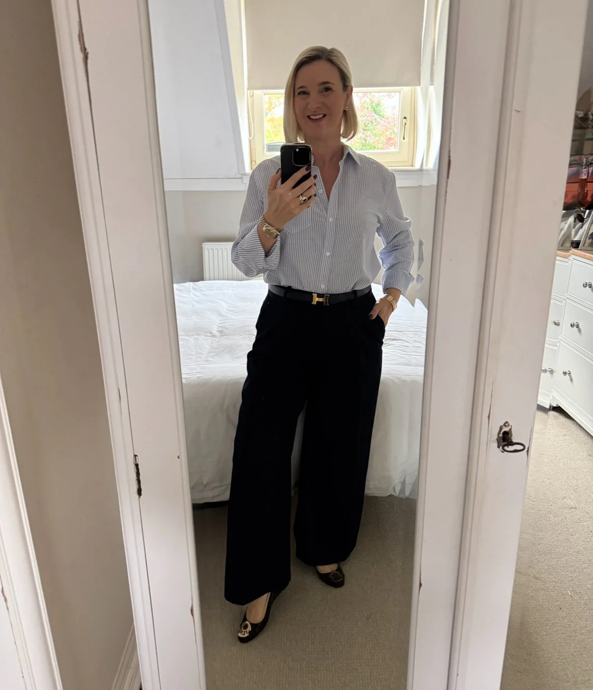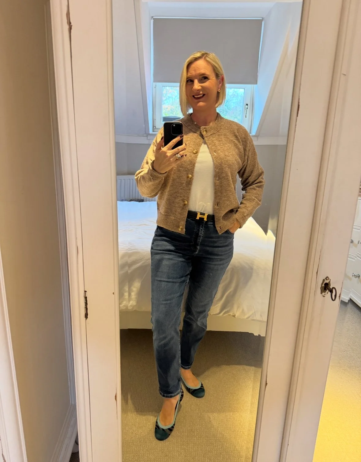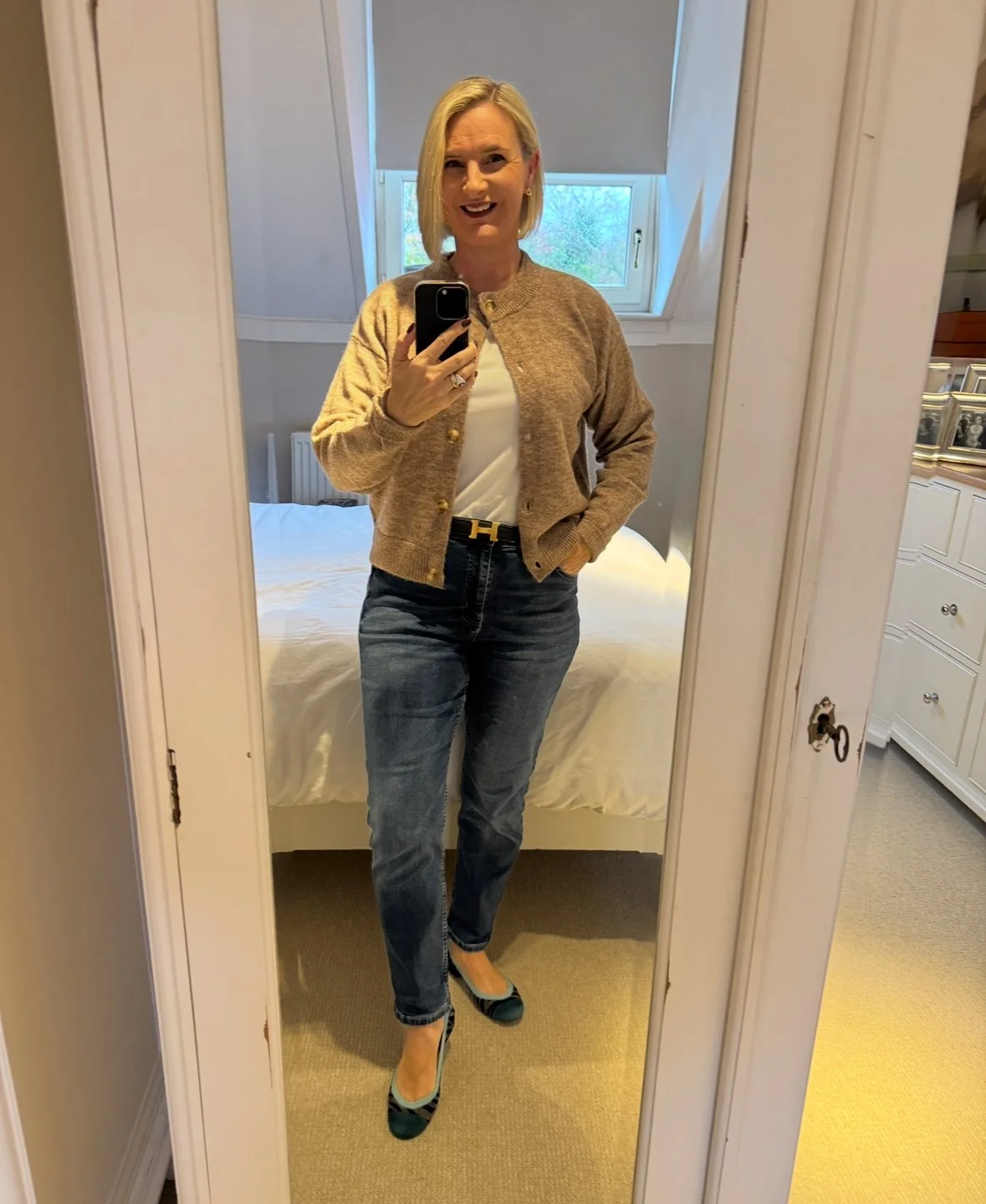 Top from M&S, Cardigan from French Connection, Shoes from Pretty Ballerina’s, Belt from Hermes.