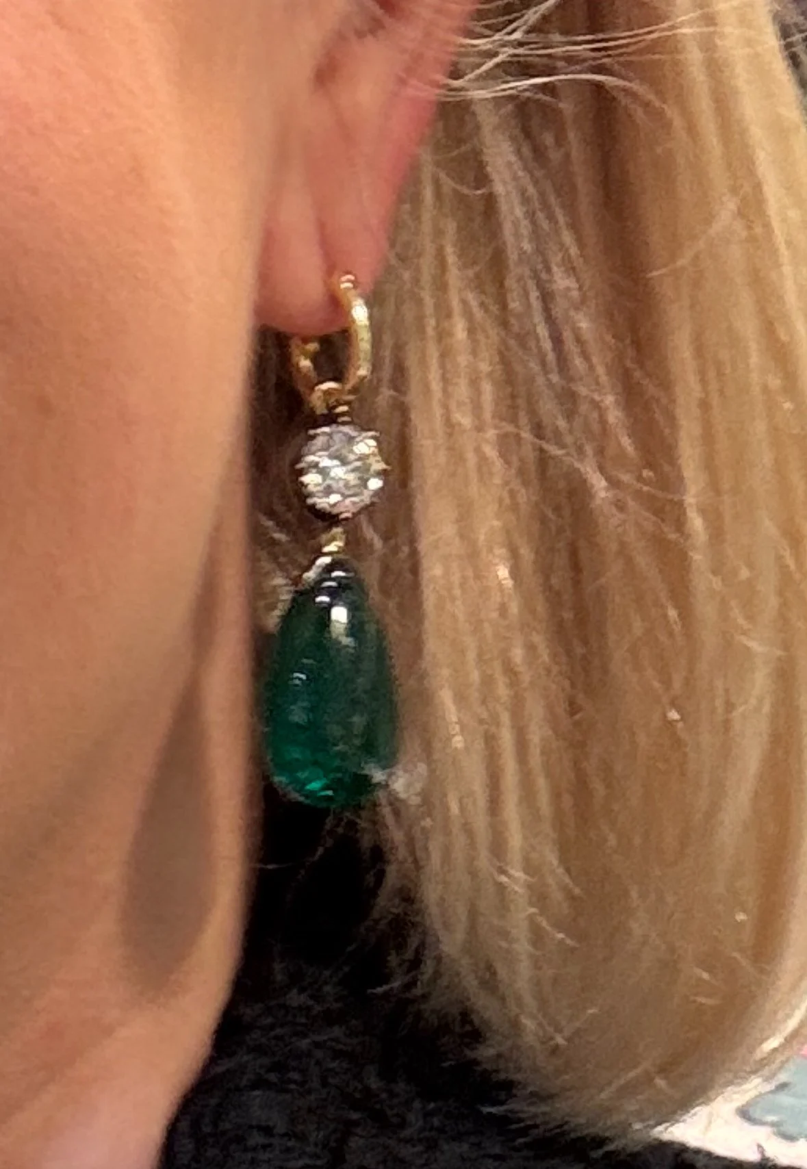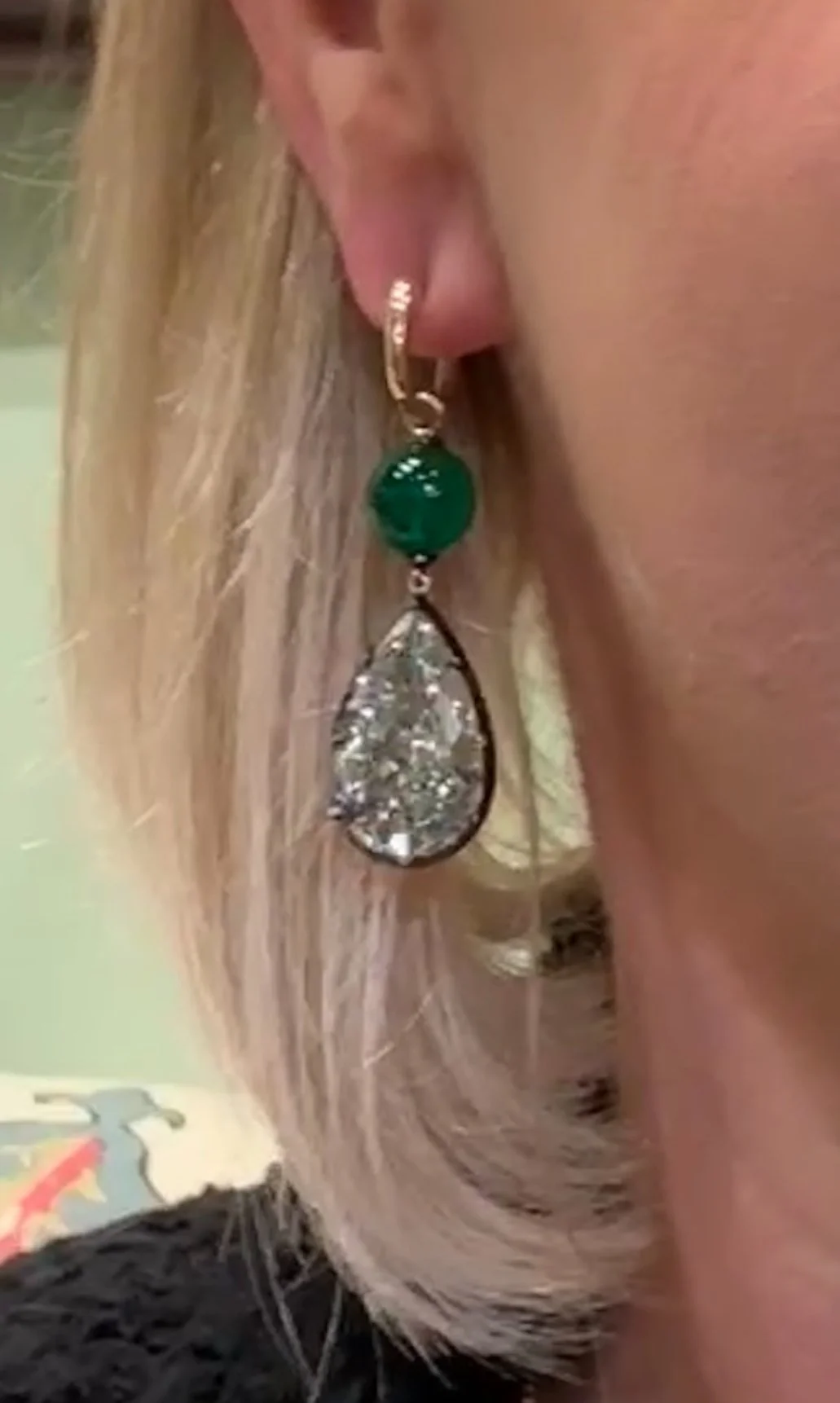 Each earring is a diamond with an emerald, and the sizes swap on each ear.