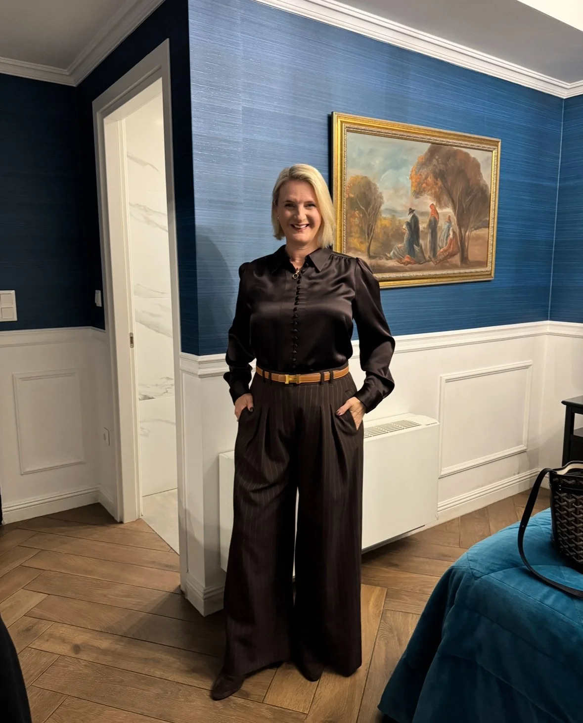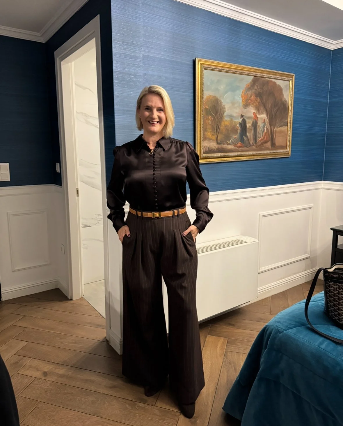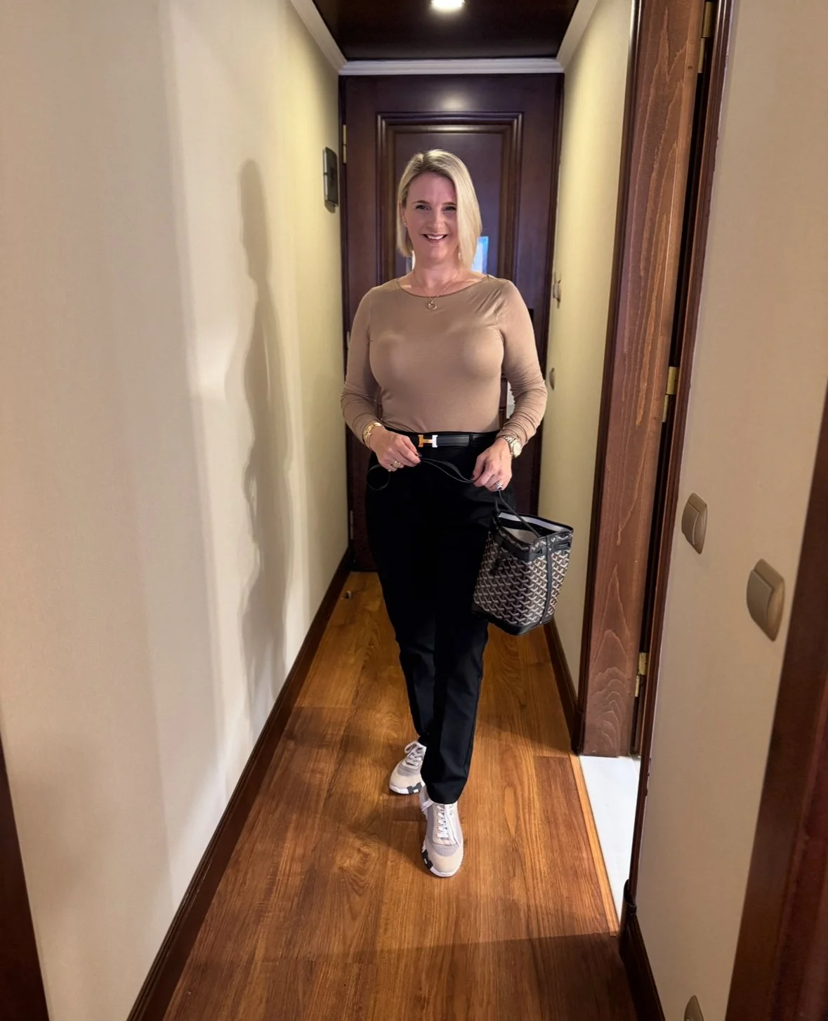 Top from Intimissimi, Trousers from Ralph Lauren, Shoes Hermes, Bag from Goyard.