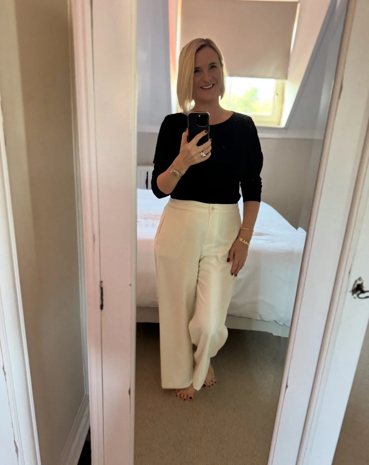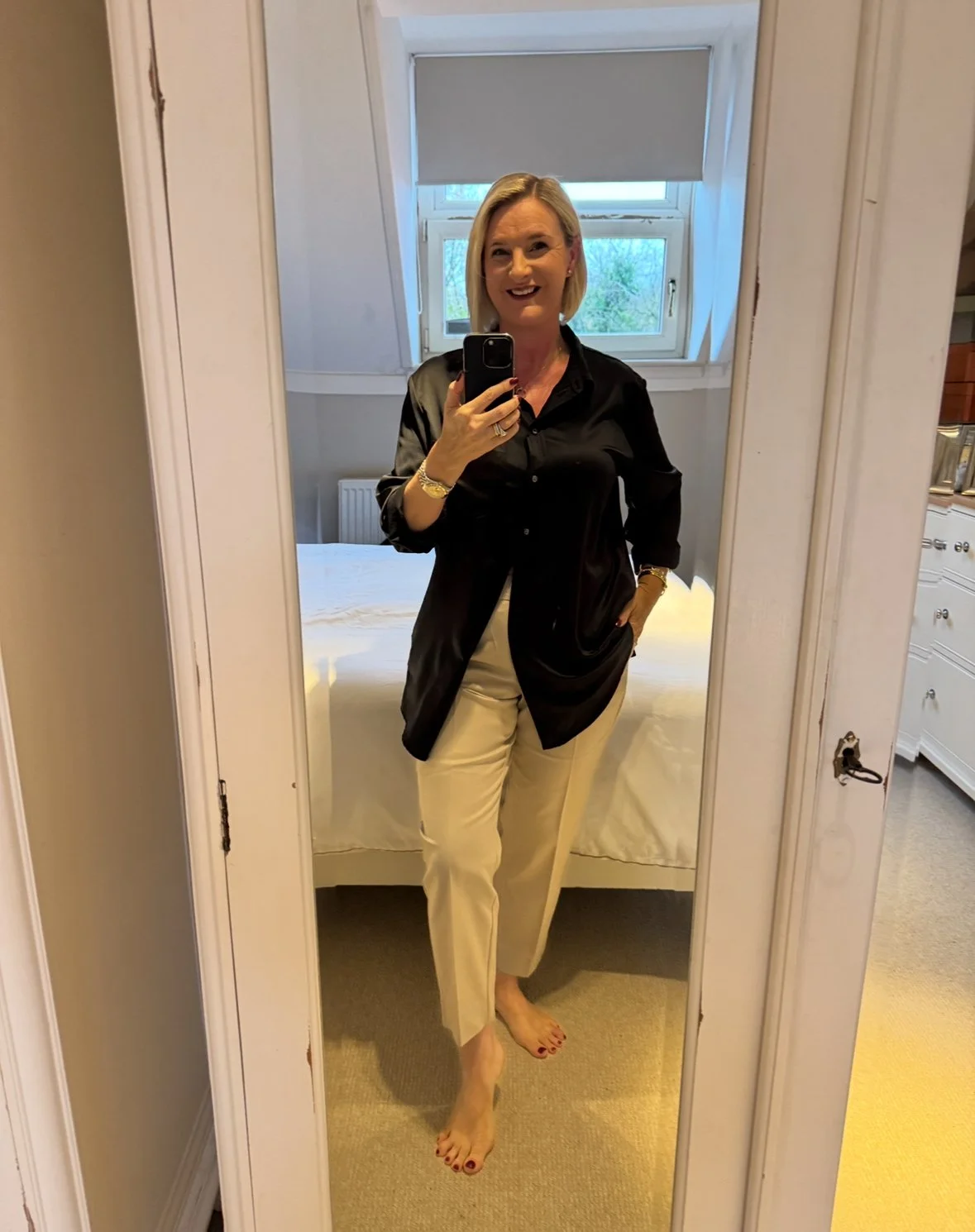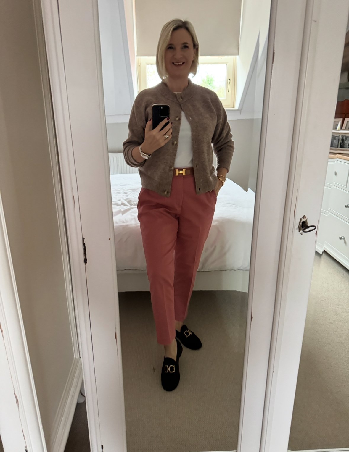 Top from Intimissimi, Trousers from Ralph Lauren, Shoes from Hermes.