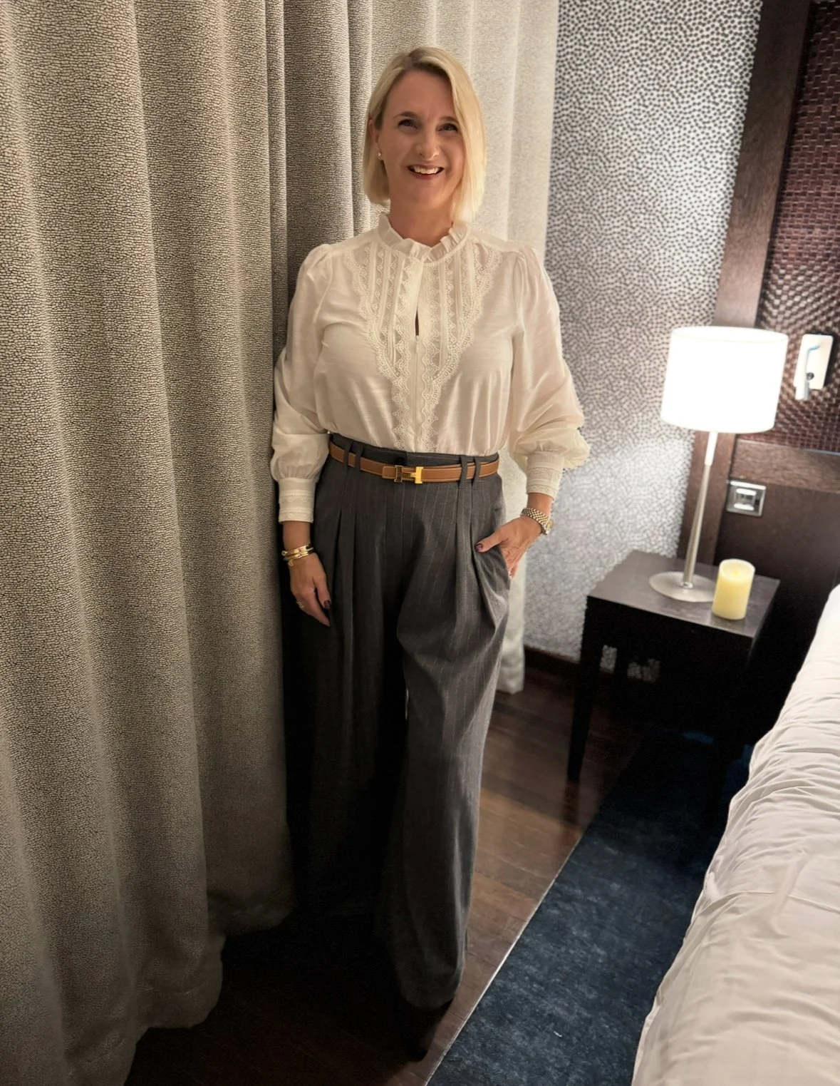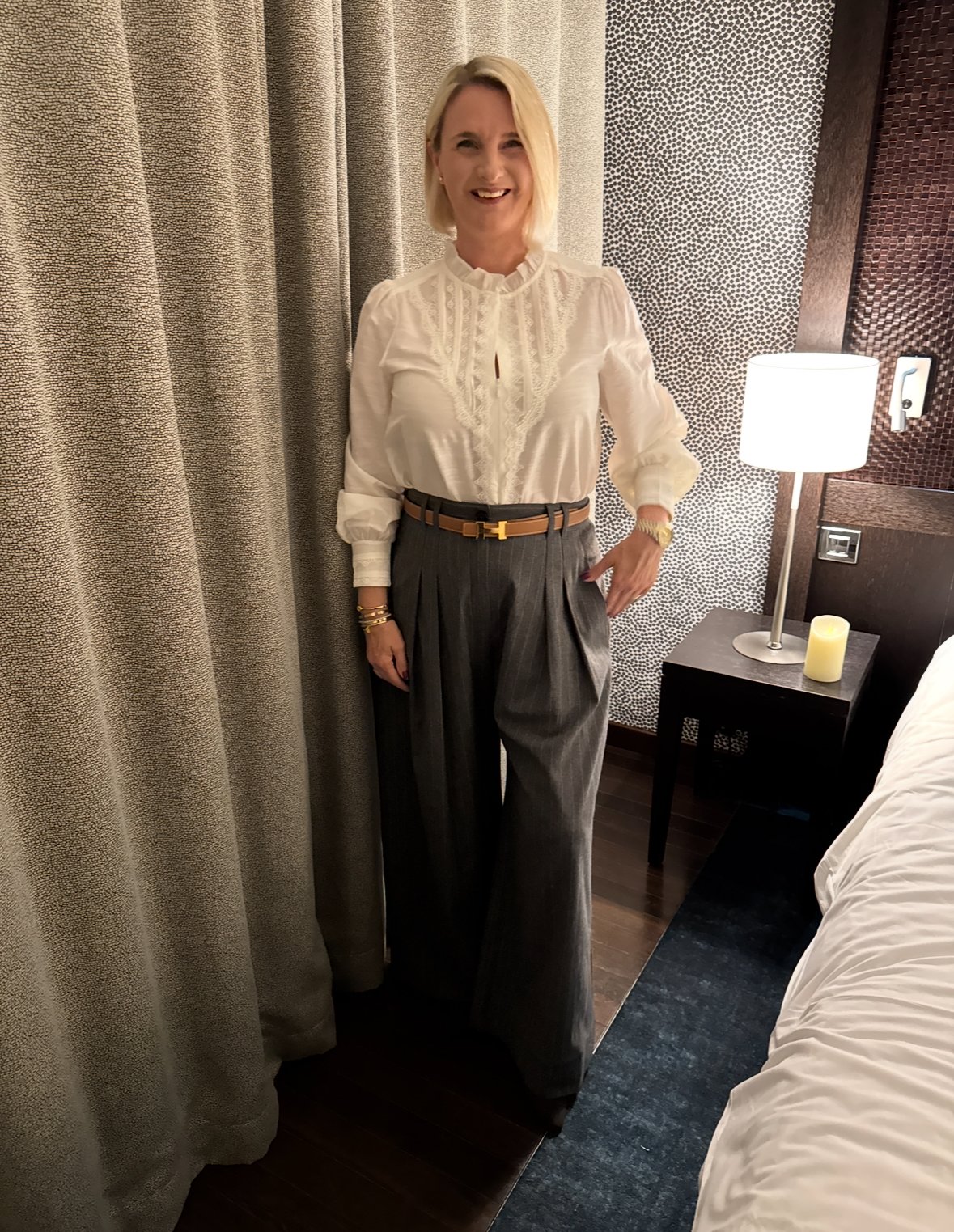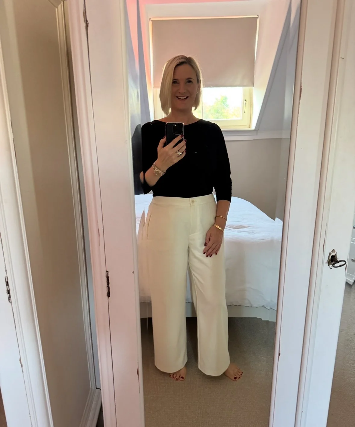 Top from Intimissimi, Trousers from Ralph Lauren, Shoes from Hermes.