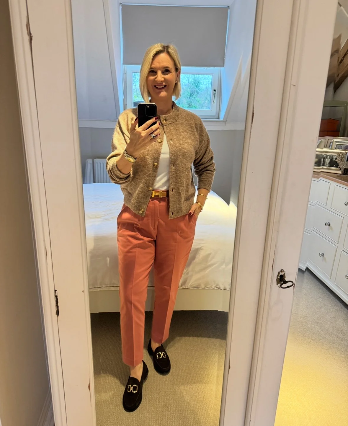 T Shirt and Shoes from M&S, Trousers from Ralph Lauren, Cardigan from French Connection.