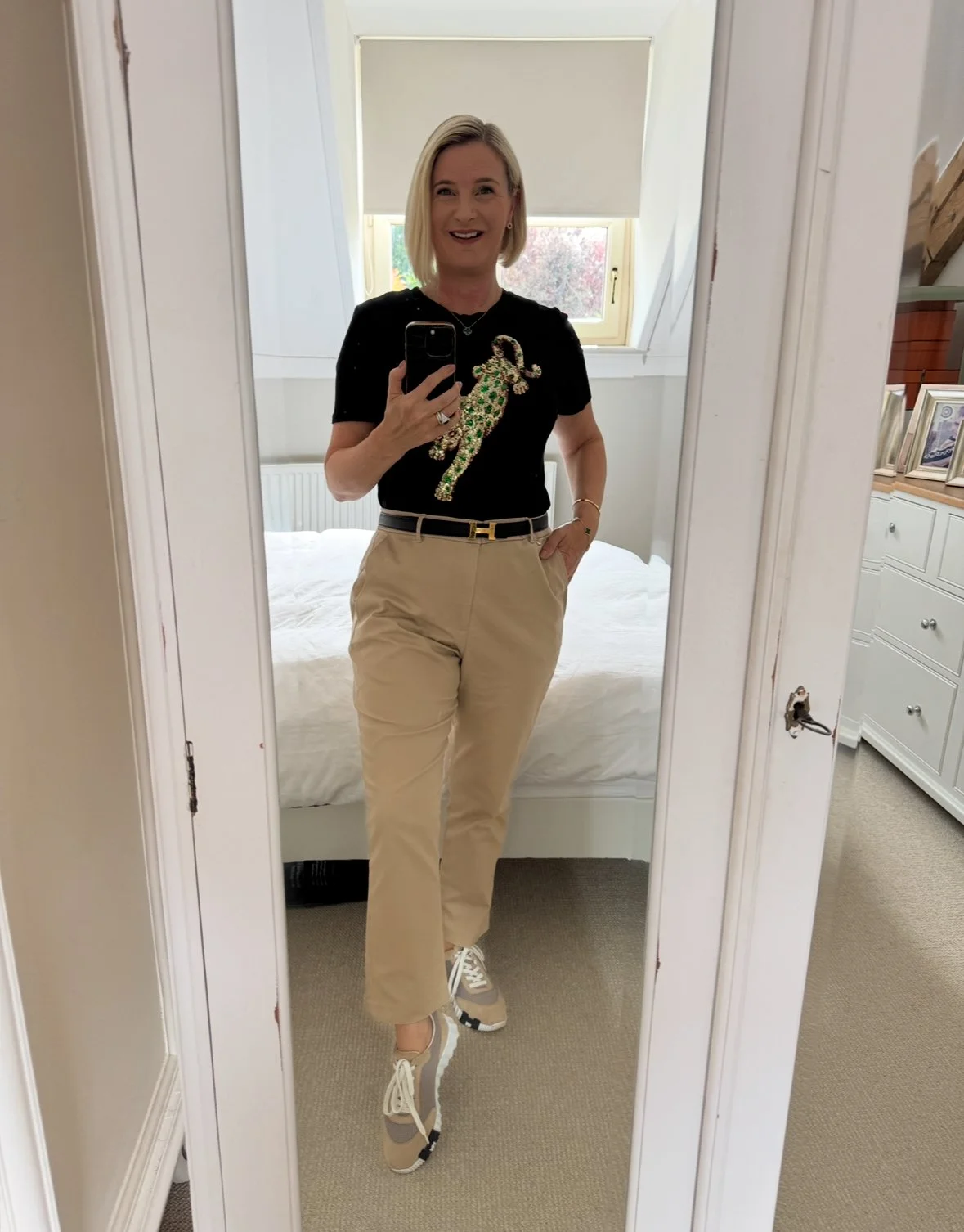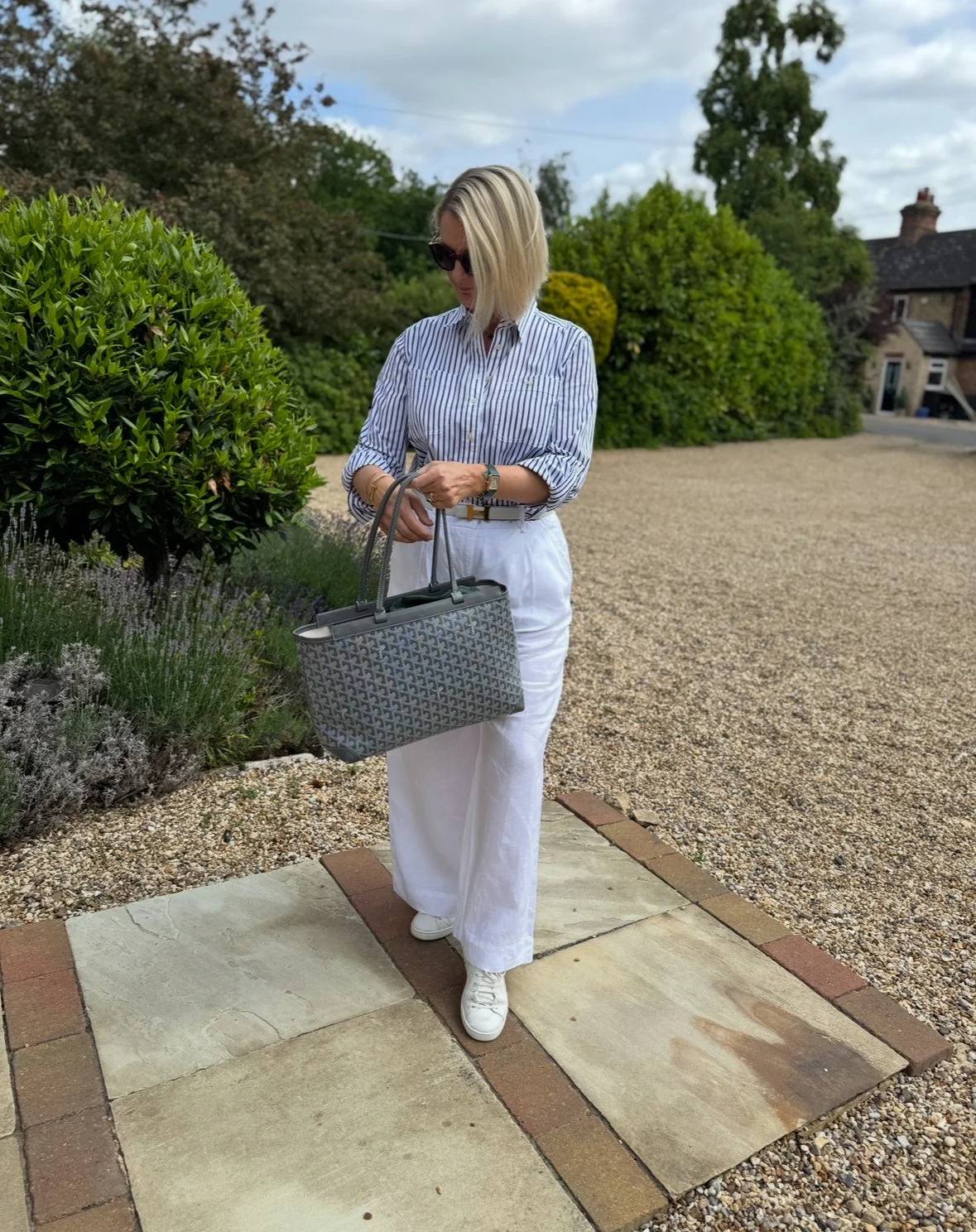 Top from Ralph Lauren, Trousers from M&S, Shoes from Louis Vuitton, Bag from Goyard.