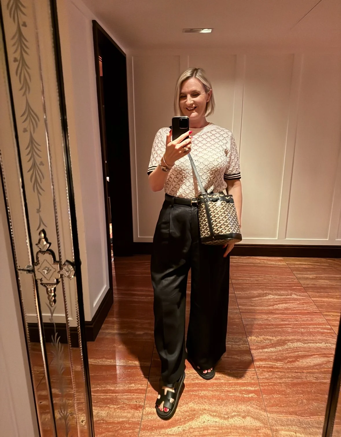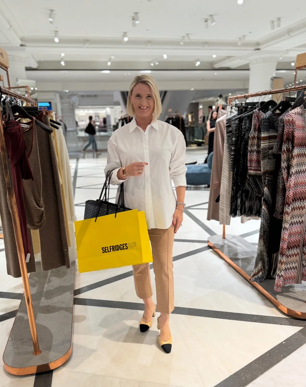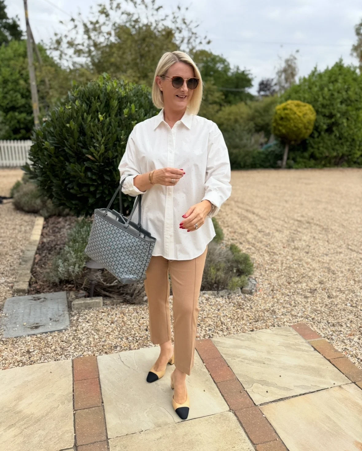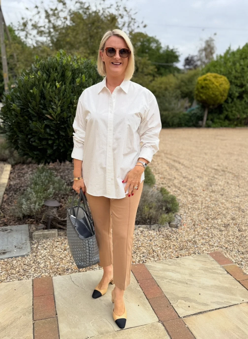 Shirt from M&S, Trousers from Micheal Kors, Bag from Goyard, Shoes from Chanel.