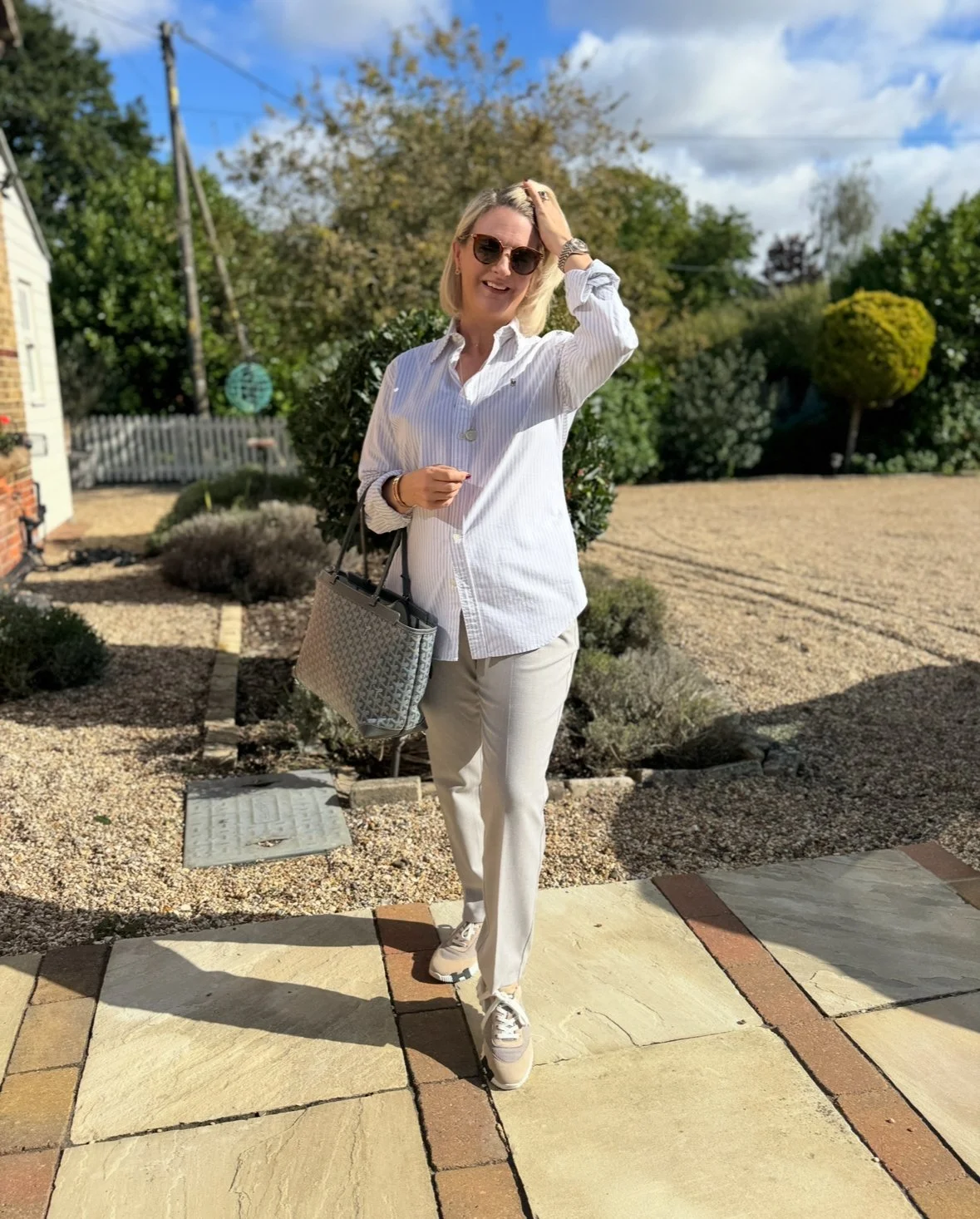 Shirt from Ralph Lauren, Trousers from H&M, bag from Goyard, Shoes from Hermes