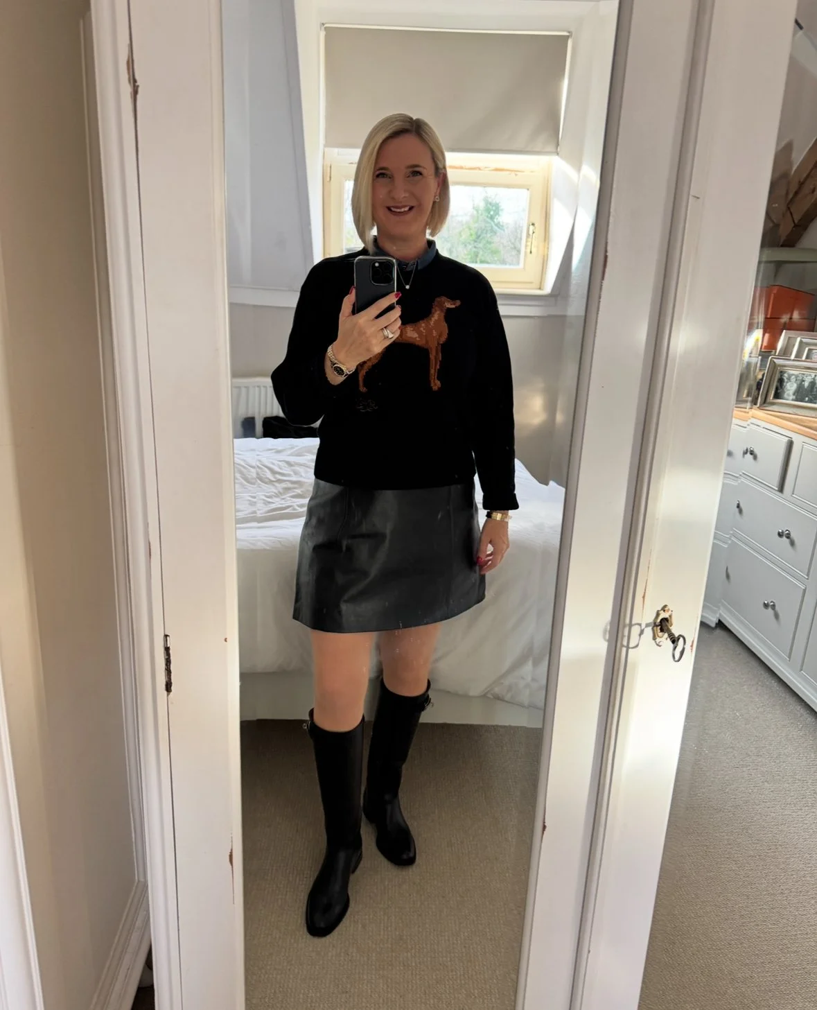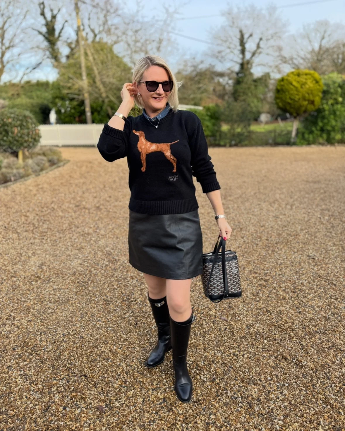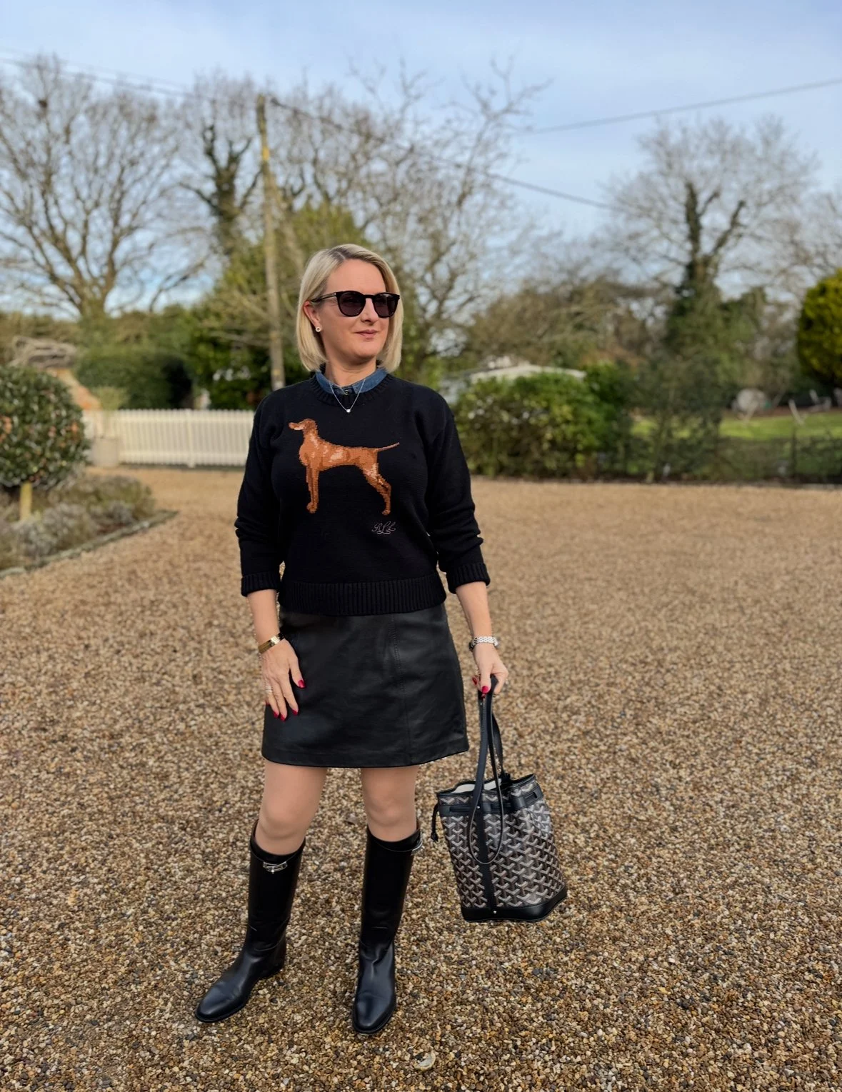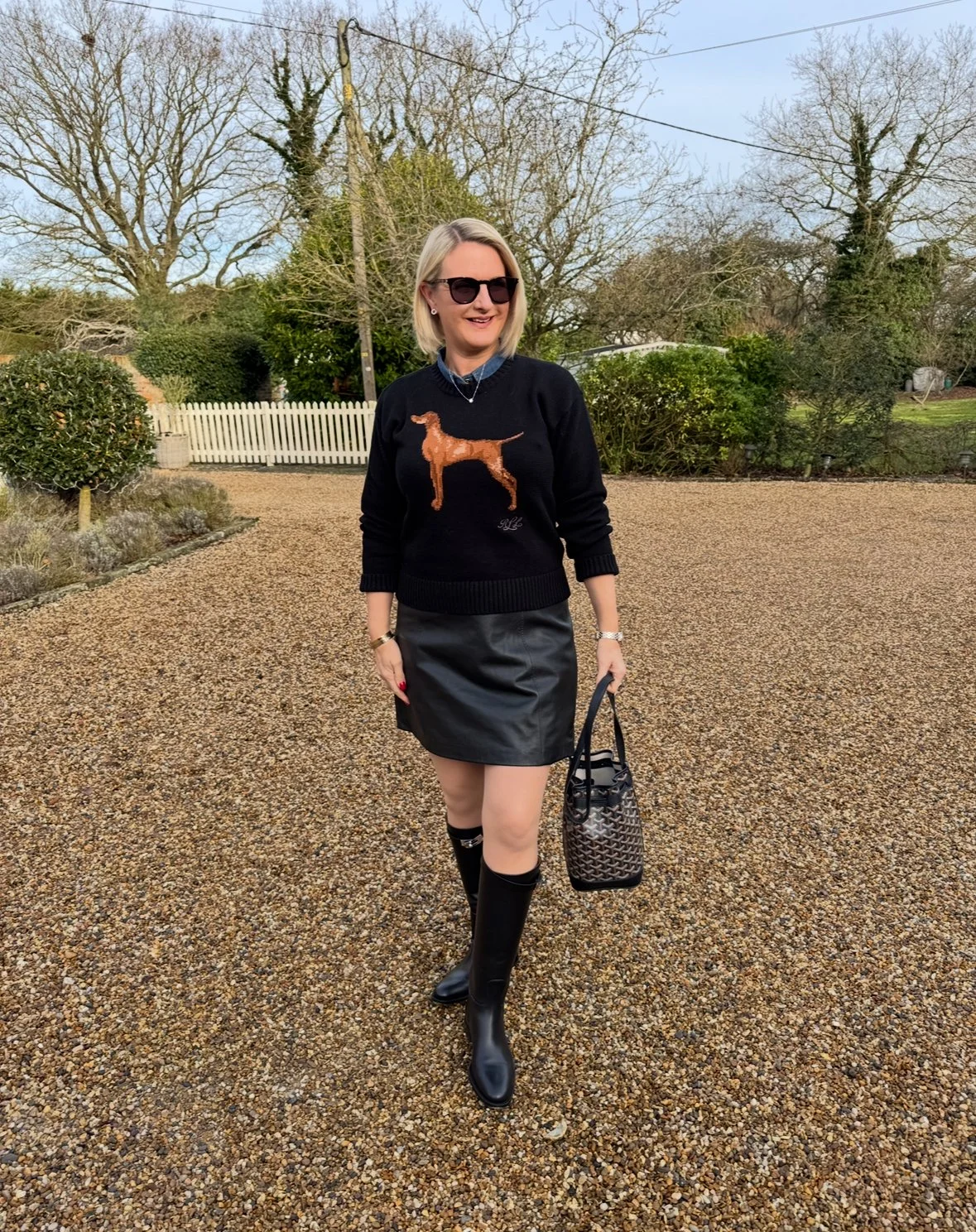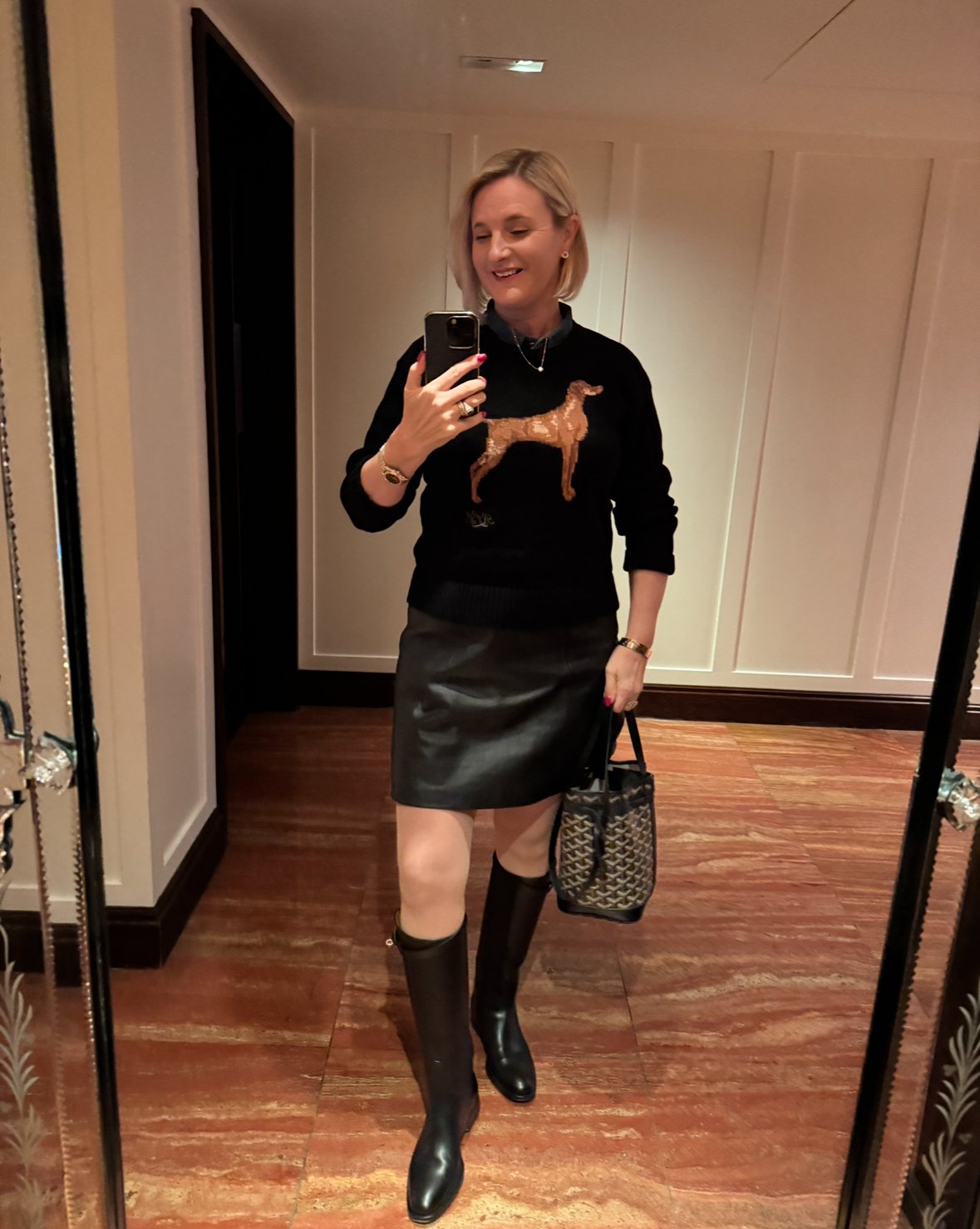 Jumper from Ralph Lauren, Faux shirt from Temu, Skirt from Reiss, Boots are the Jumping Boots from Hermes, Bag from Goyard.