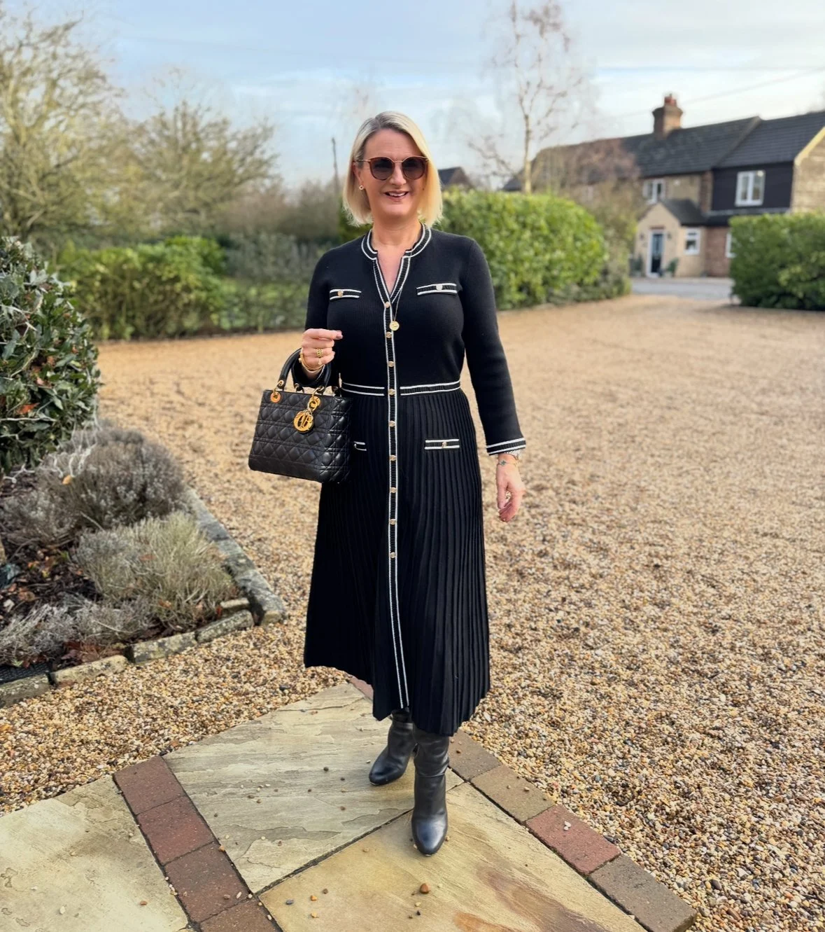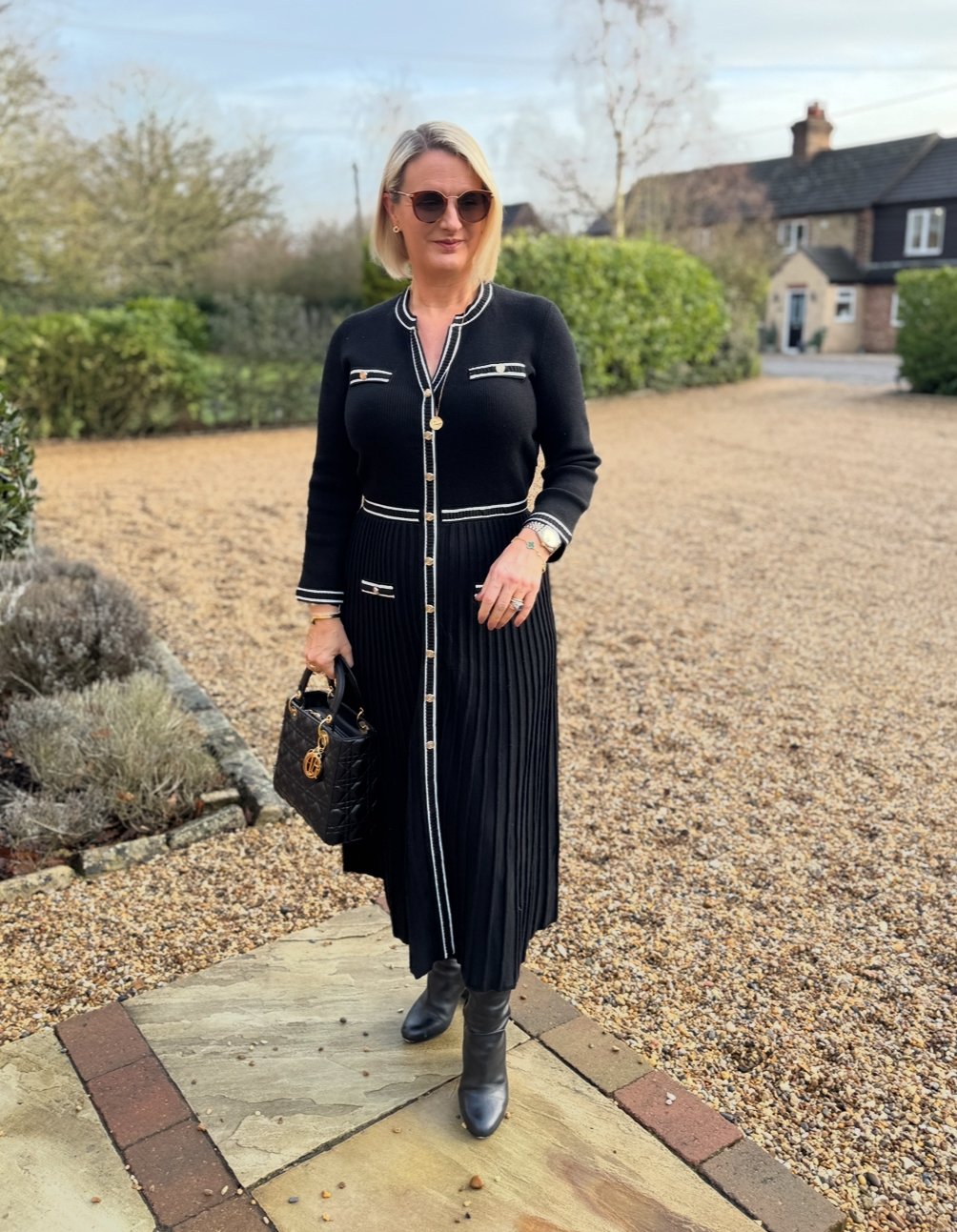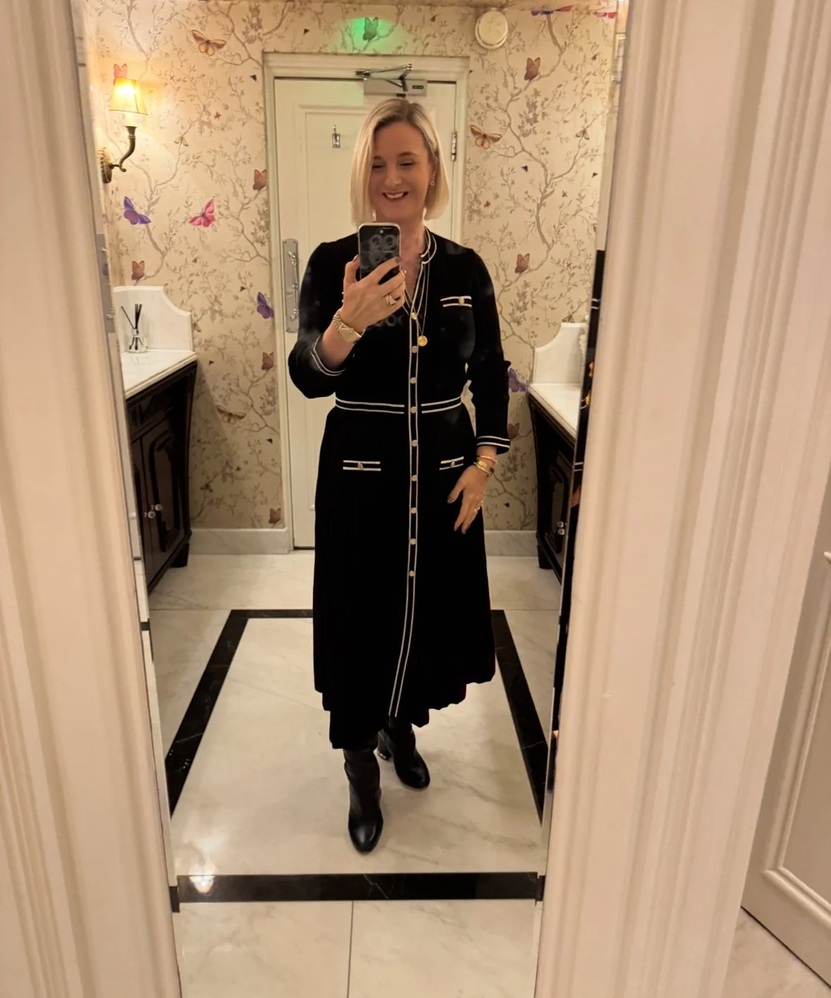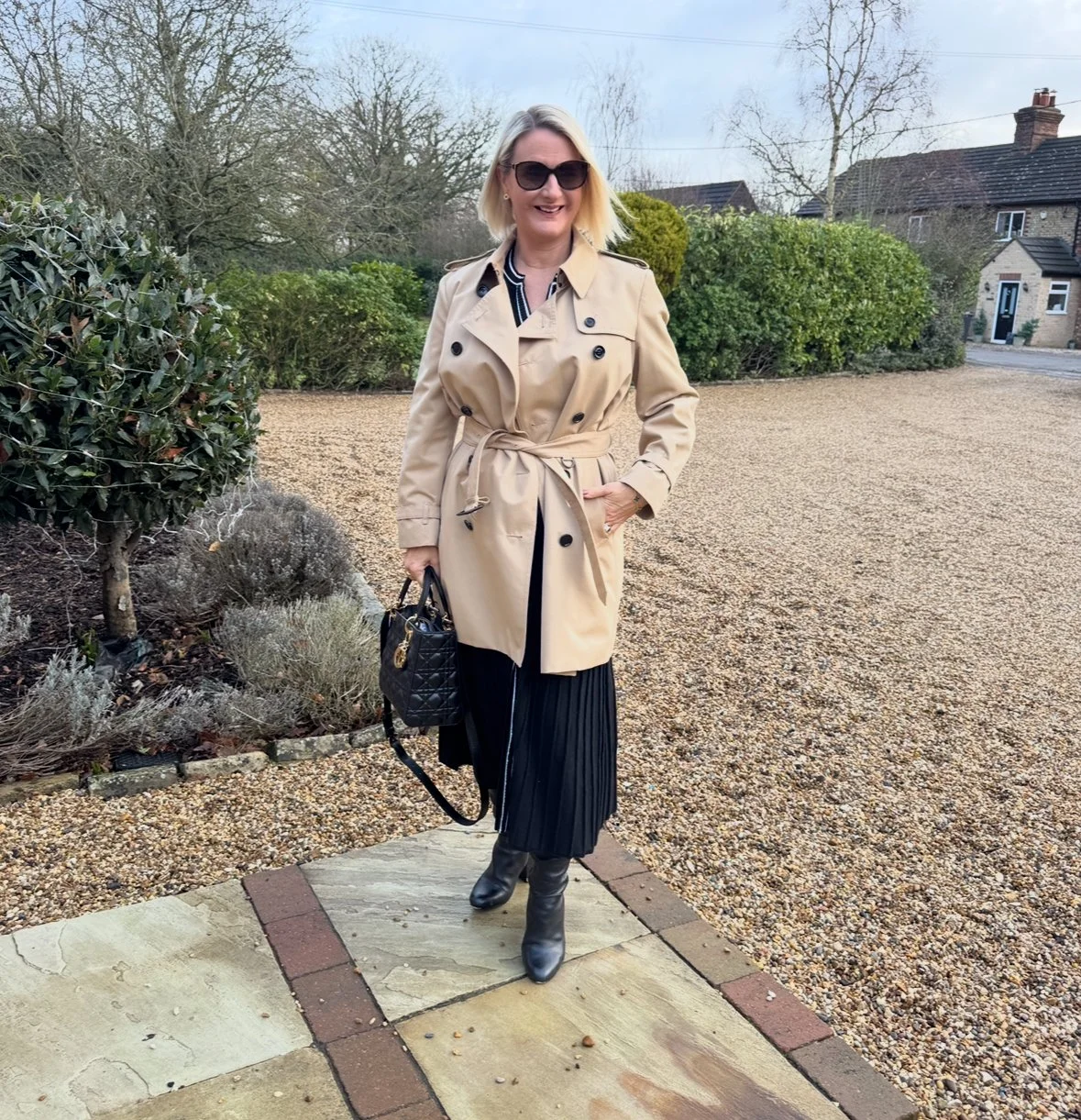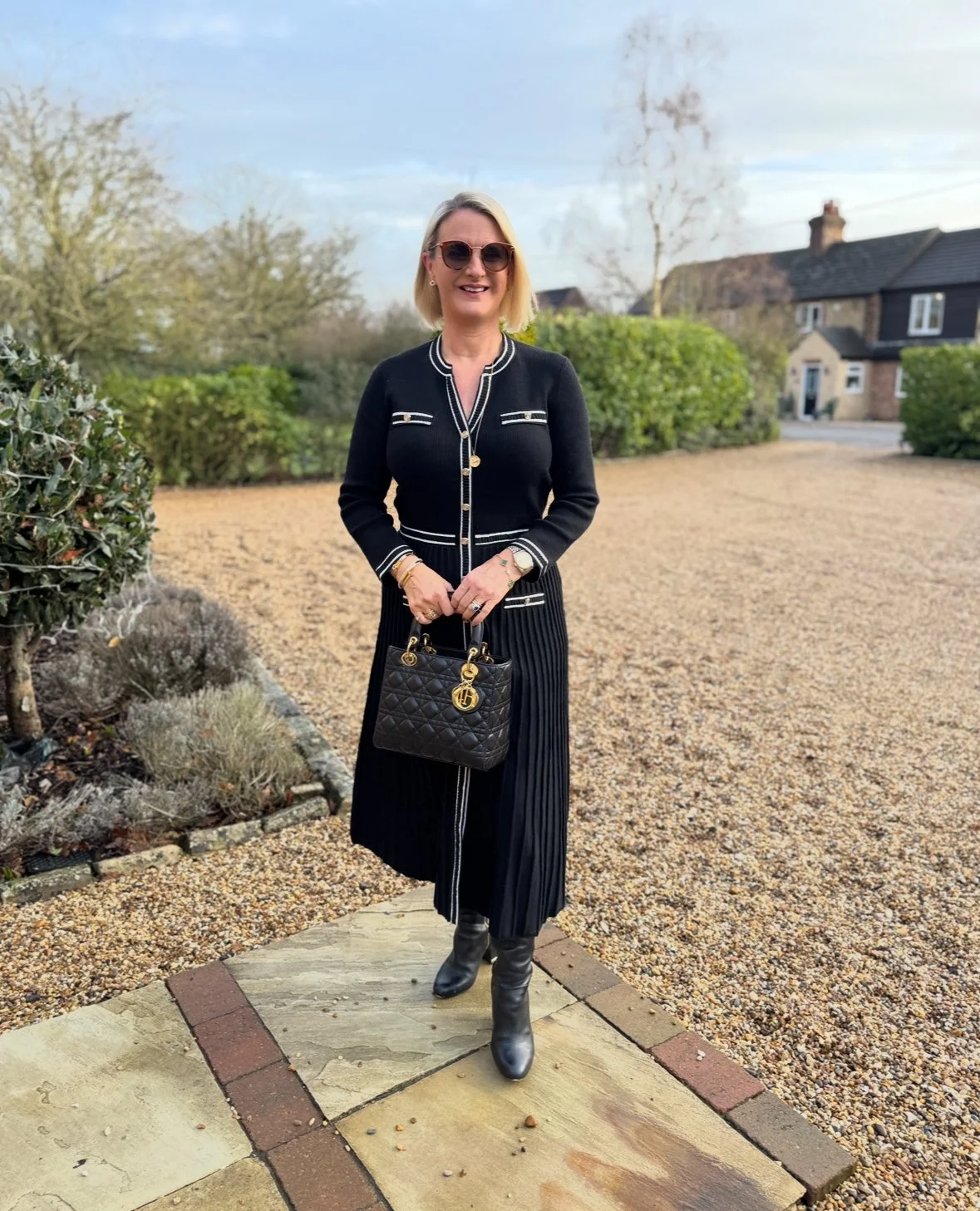 Jumper from Ralph Lauren, Faux shirt from Temu, Skirt from Reiss, Boots are the Jumping Boots from Hermes, Bag from Goyard.