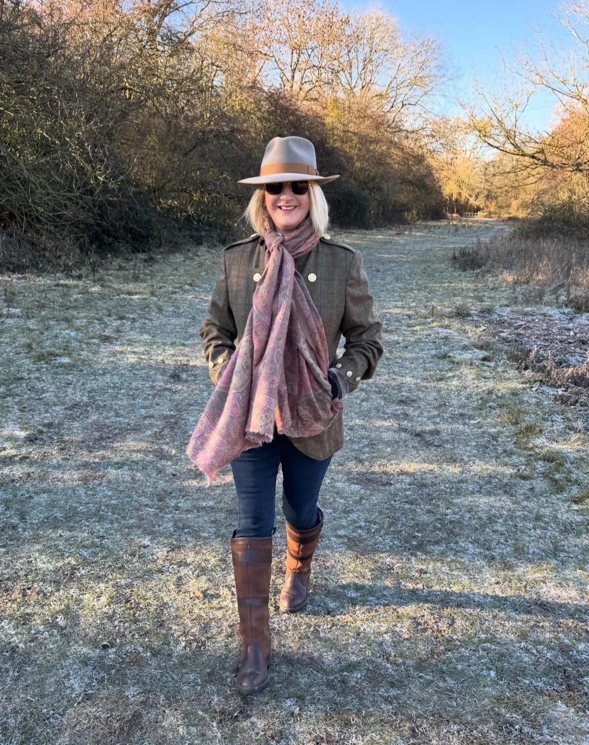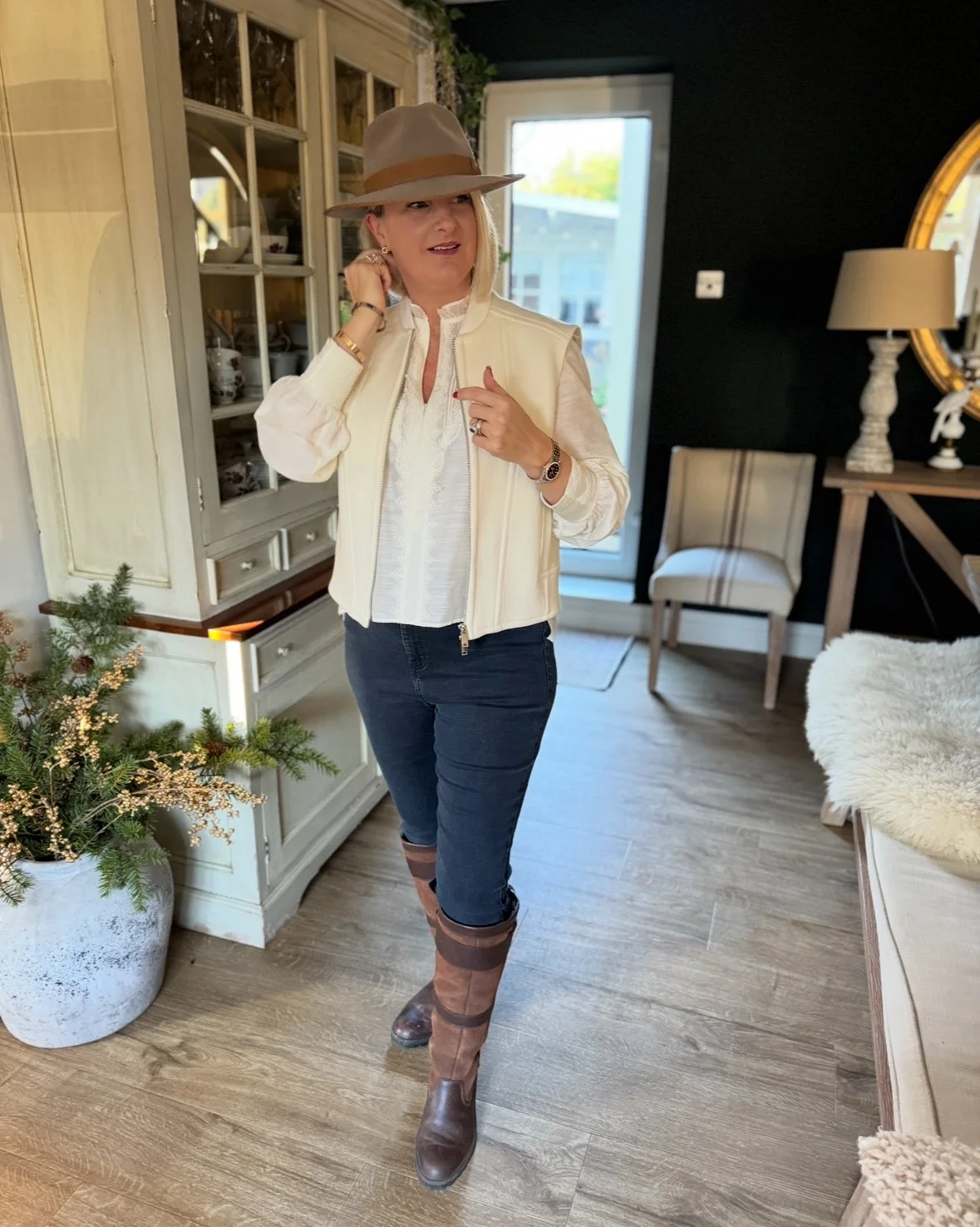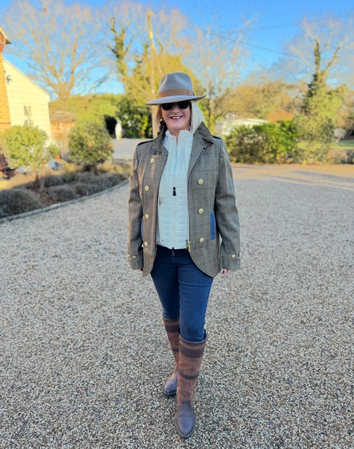 Blouse and Gilet from Me&Em, Jeans from Topshop, Boots from Dubarry, Coat from Holland Cooper, Hat from Lairds.
