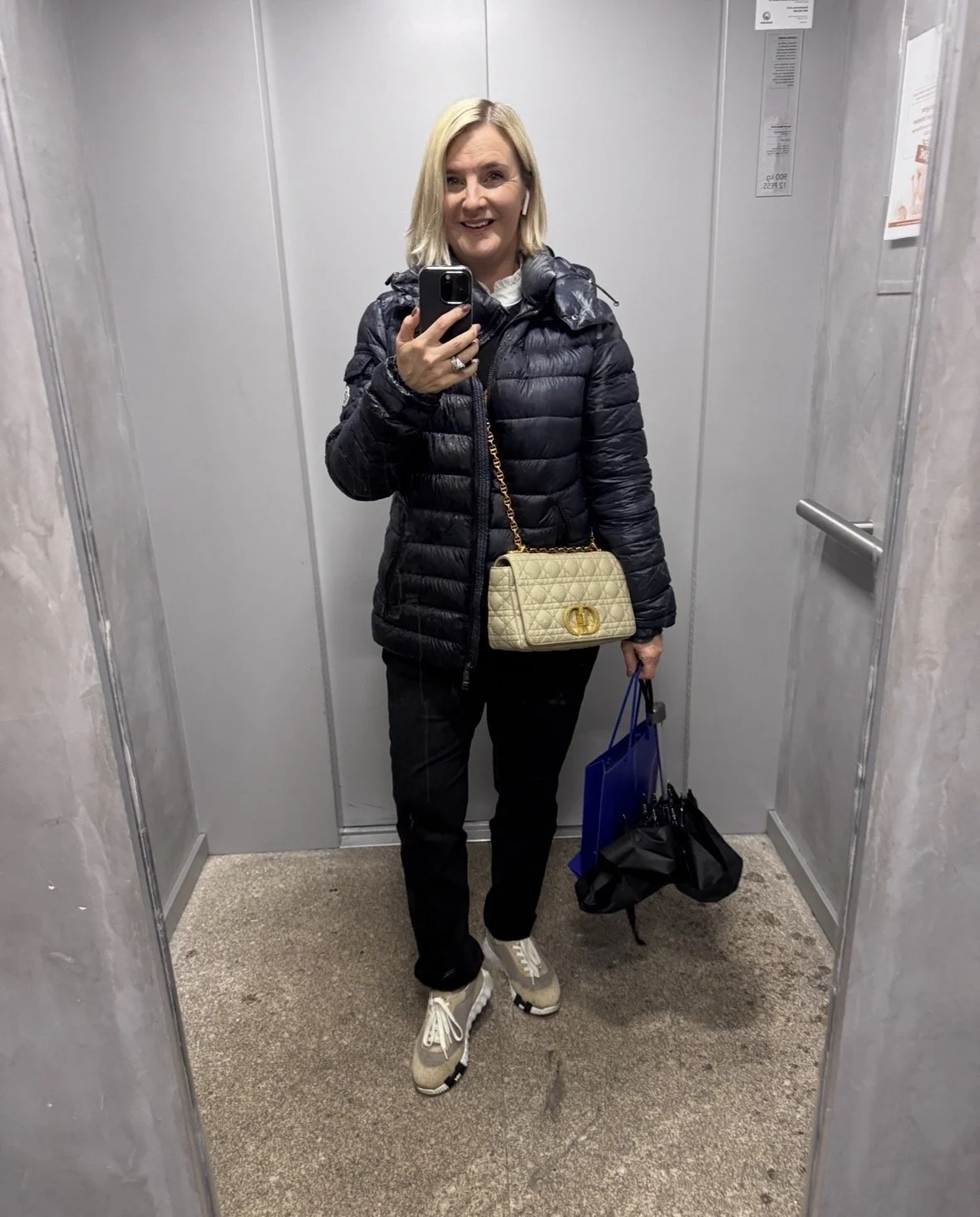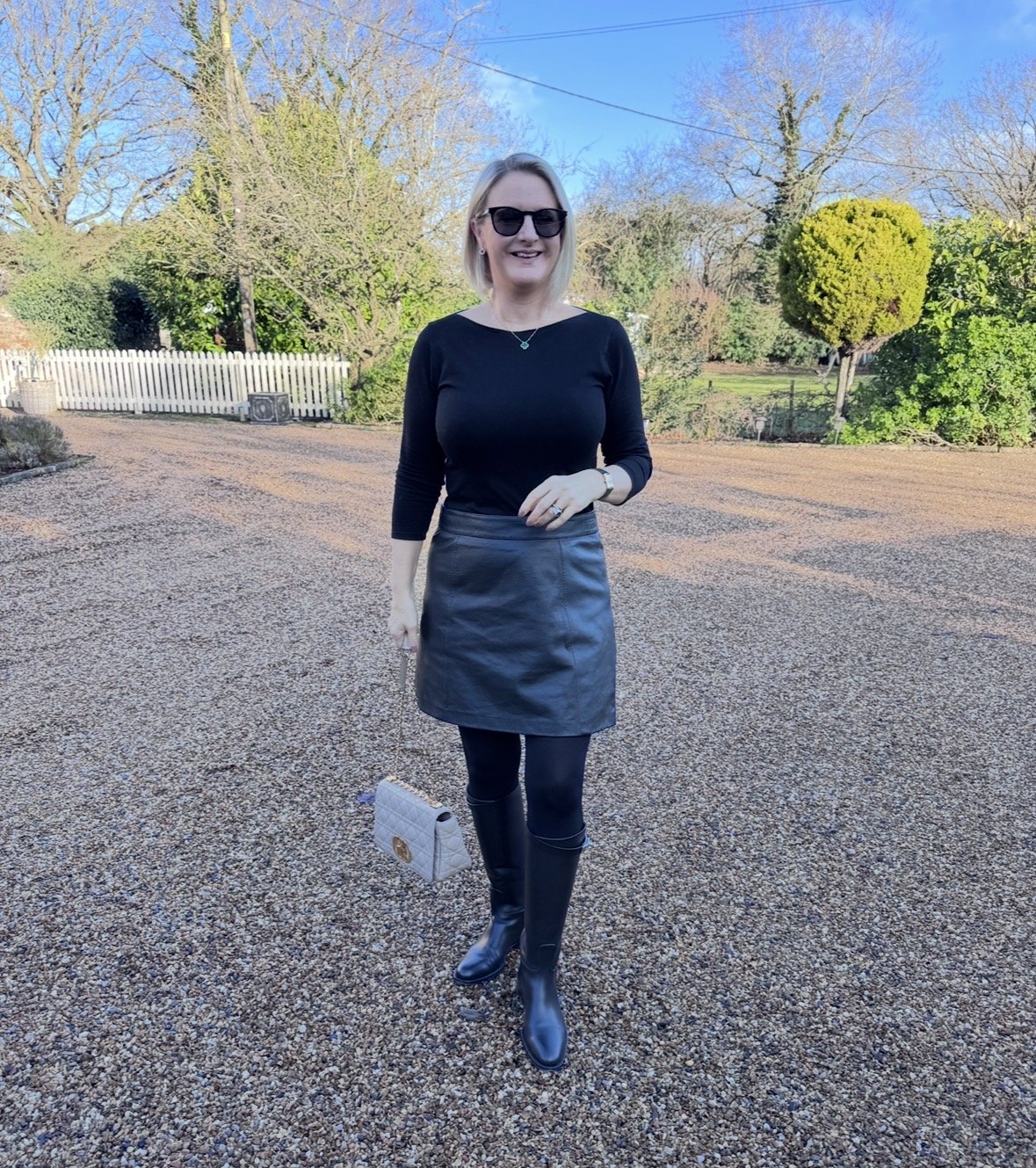 Top from M&S, Skirt from Reiss, Tights from Tesco, Boots from Hermes, Bag from Dior.