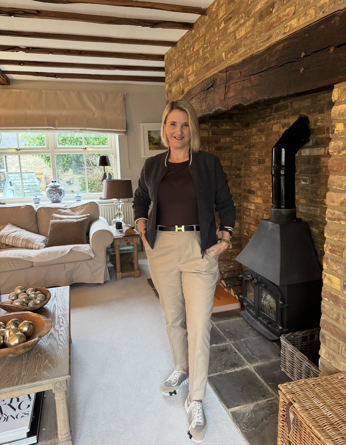Top from Intimissimi, Cardigan from Me&Em, Trousers from Ralph Lauren and Shoes from Hermes.