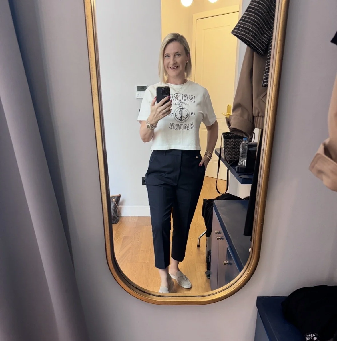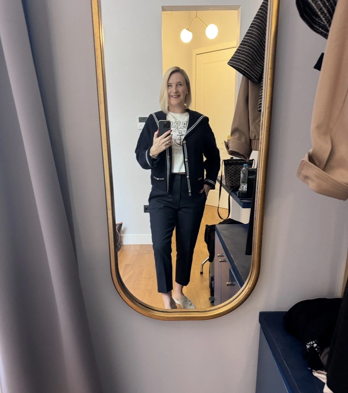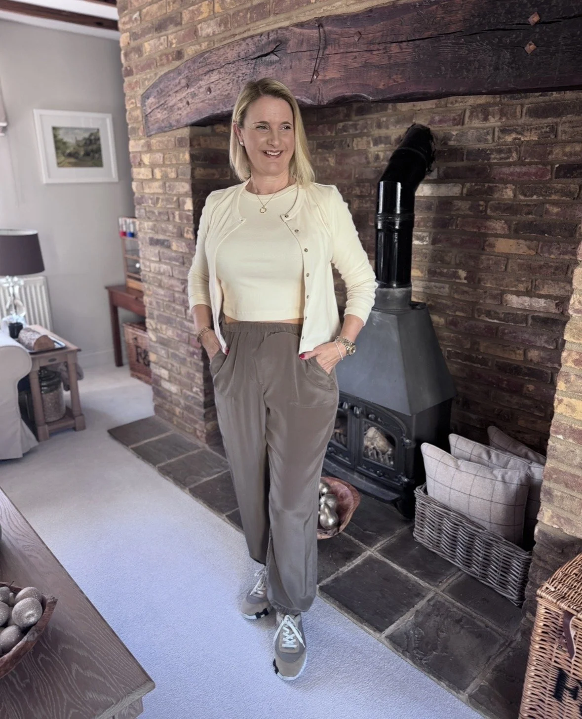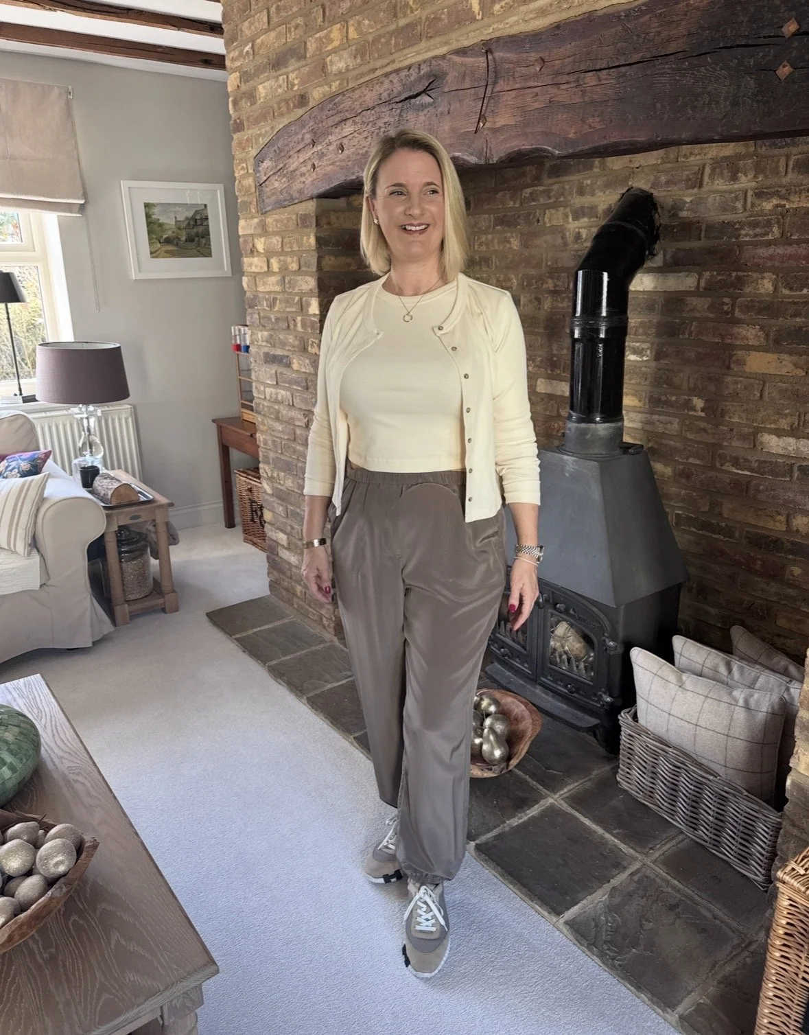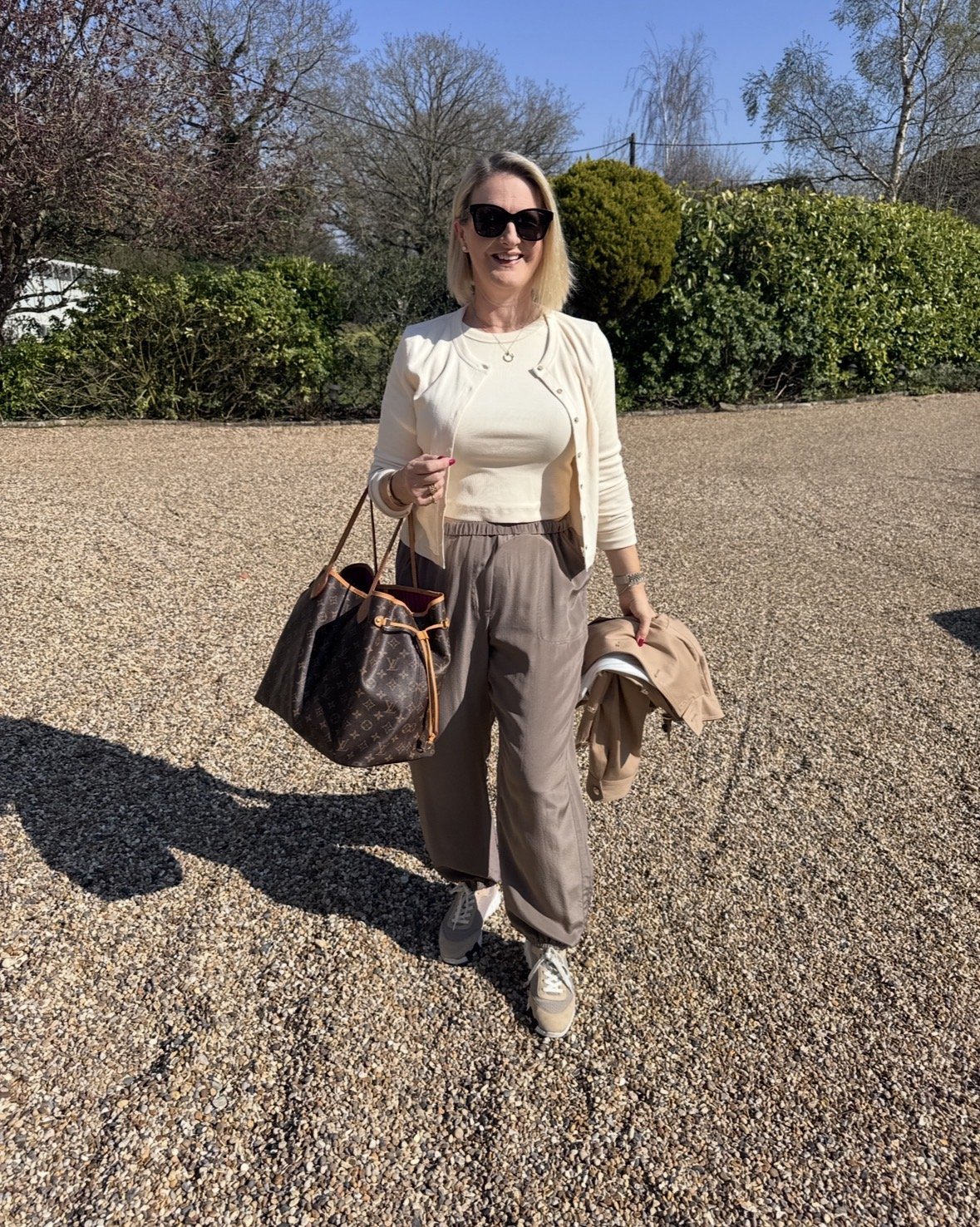 Top and matching cardigan from Me&Em, Trousers from The White Company, Shoes from Hermes, Bag from Louis Vuitton.