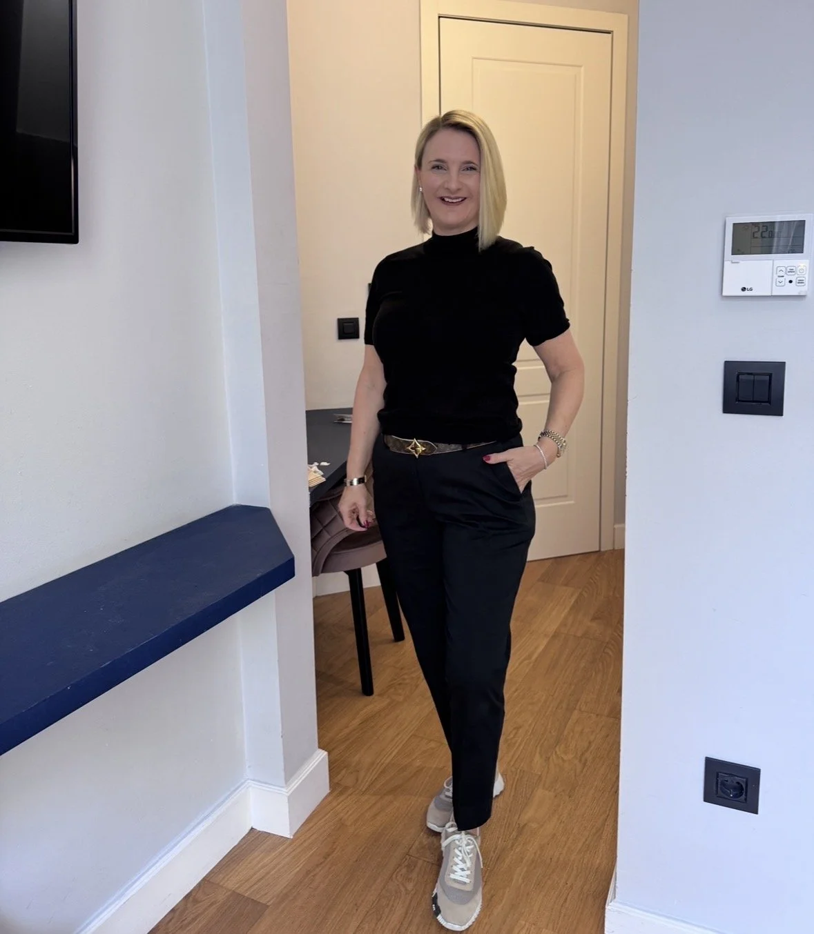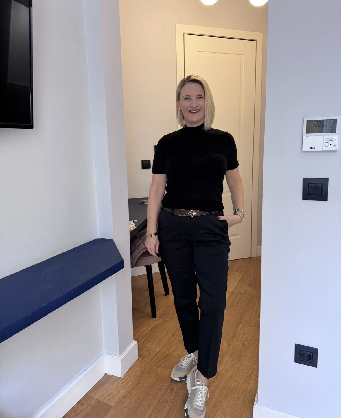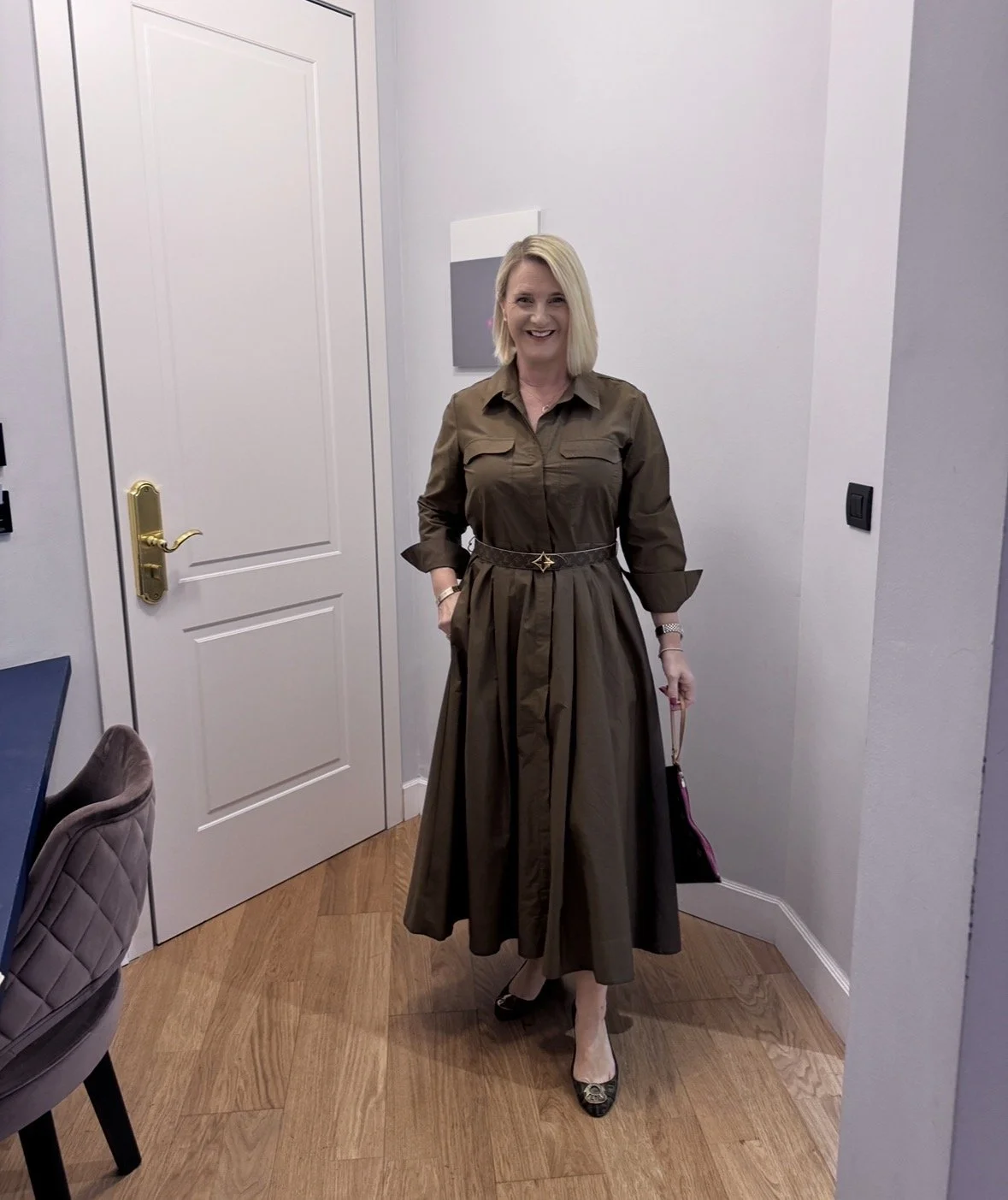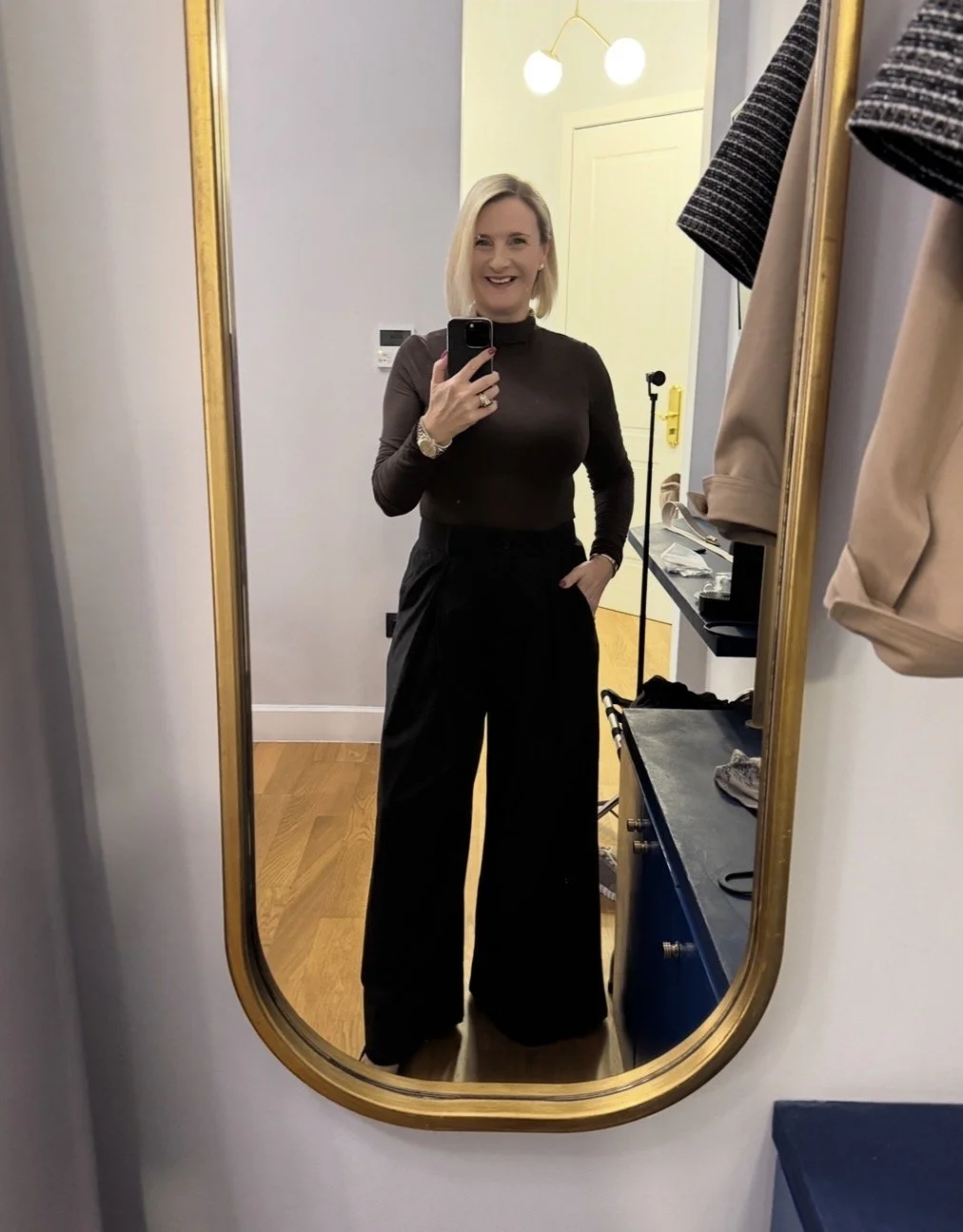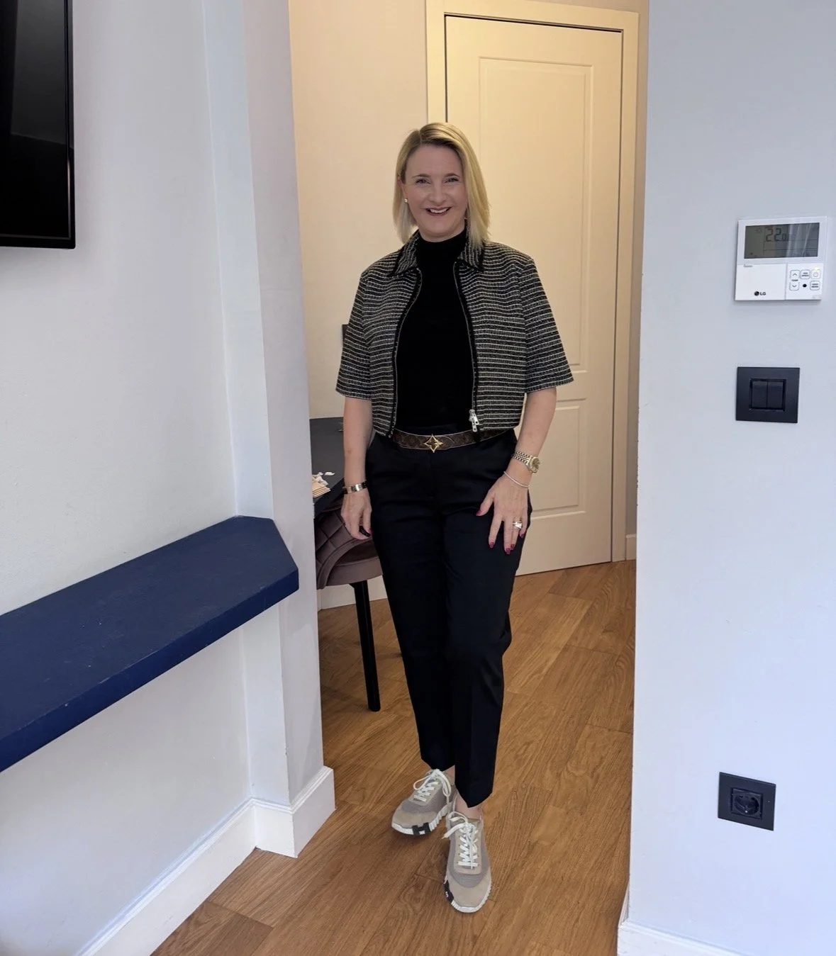 Top and matching cardigan from Me&Em, Trousers from The White Company, Shoes from Hermes, Bag from Louis Vuitton.