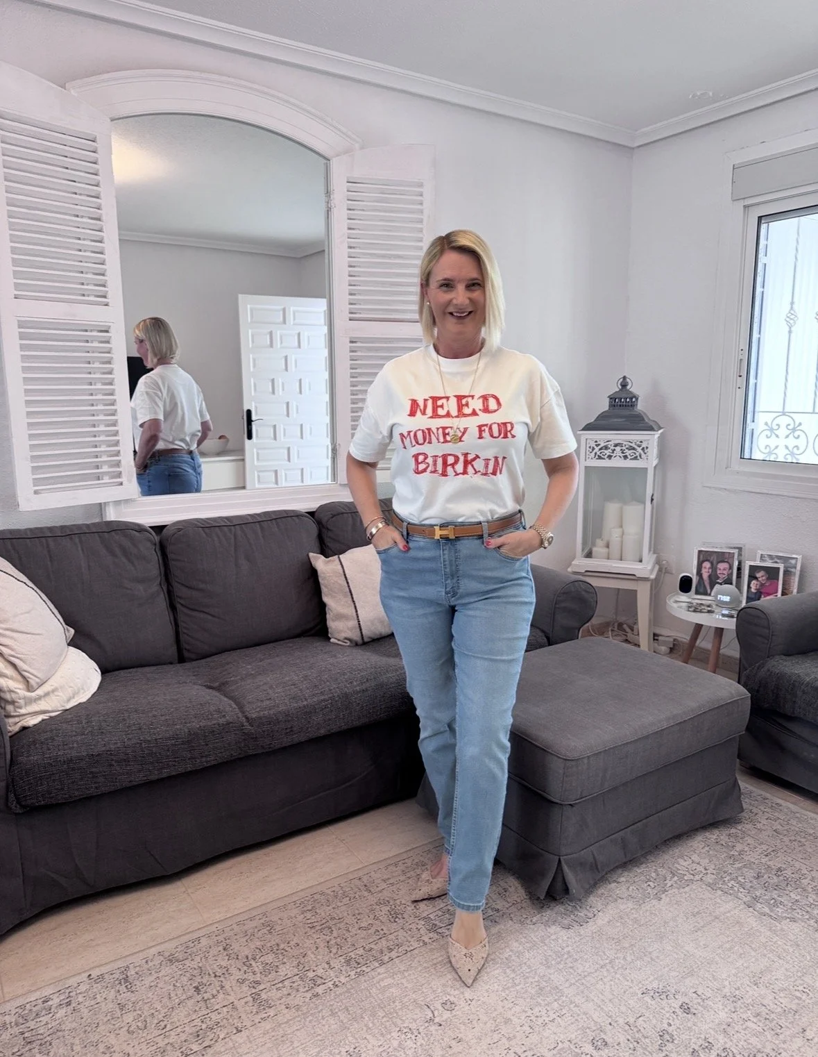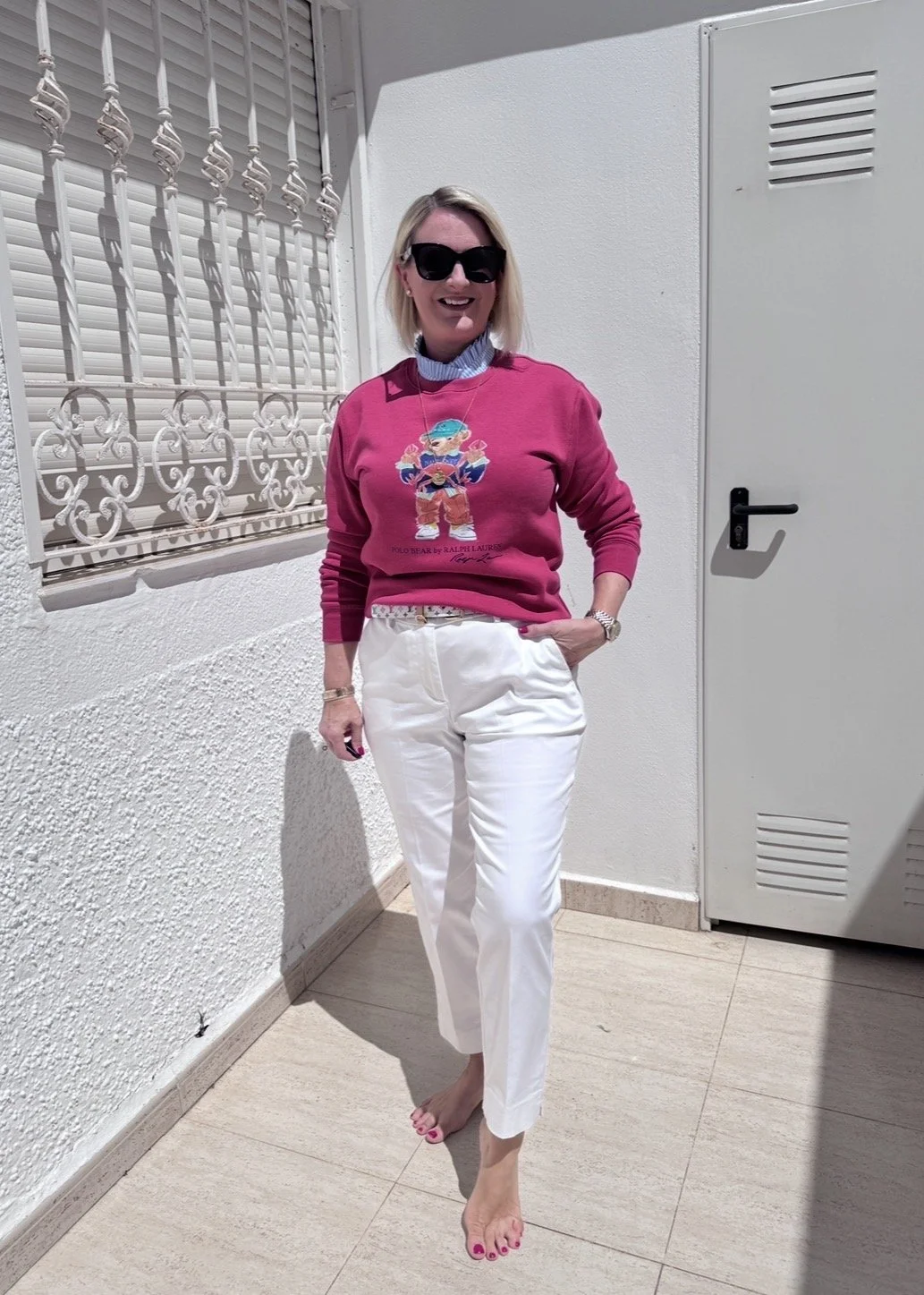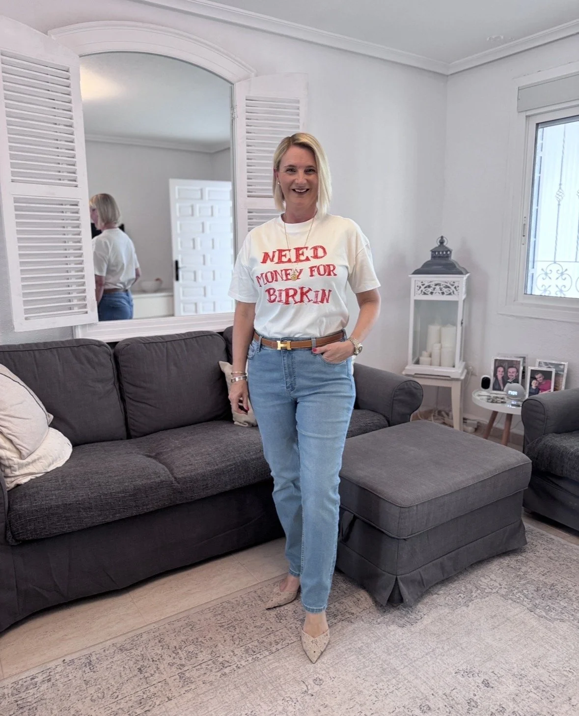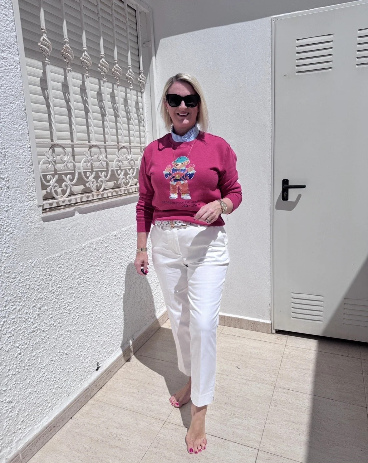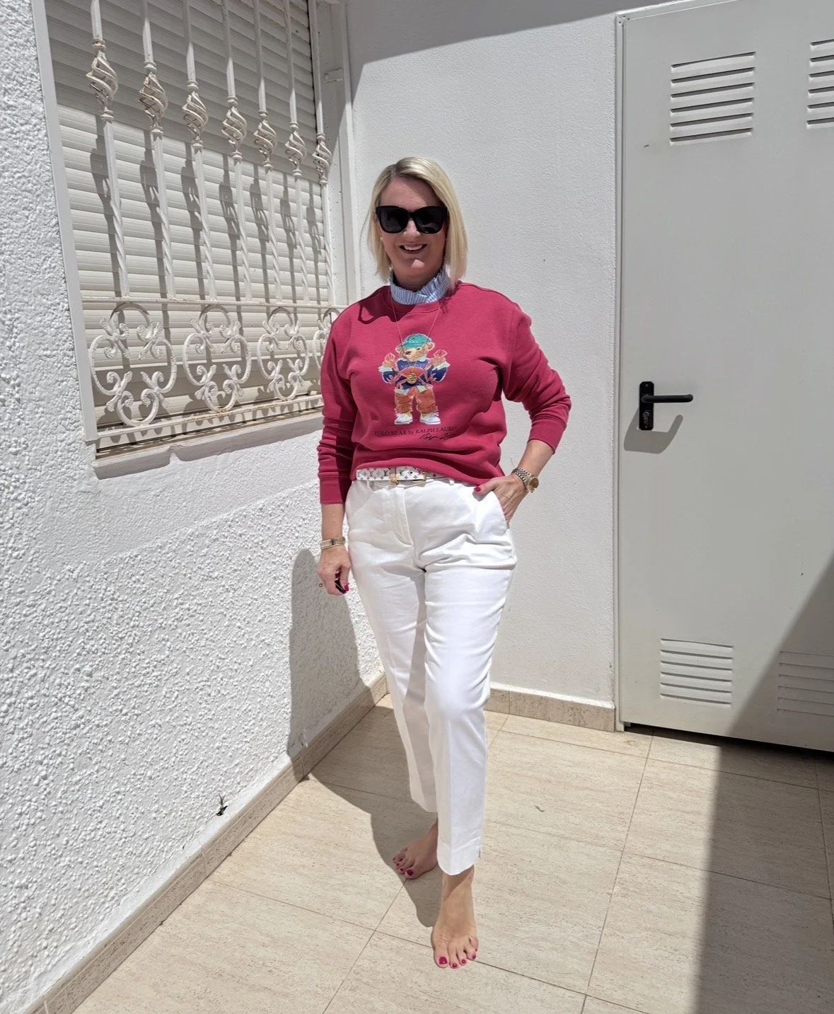 Top from Ralph Lauren, Jeans from Tesco, Shoes from Jimmy Choo.
