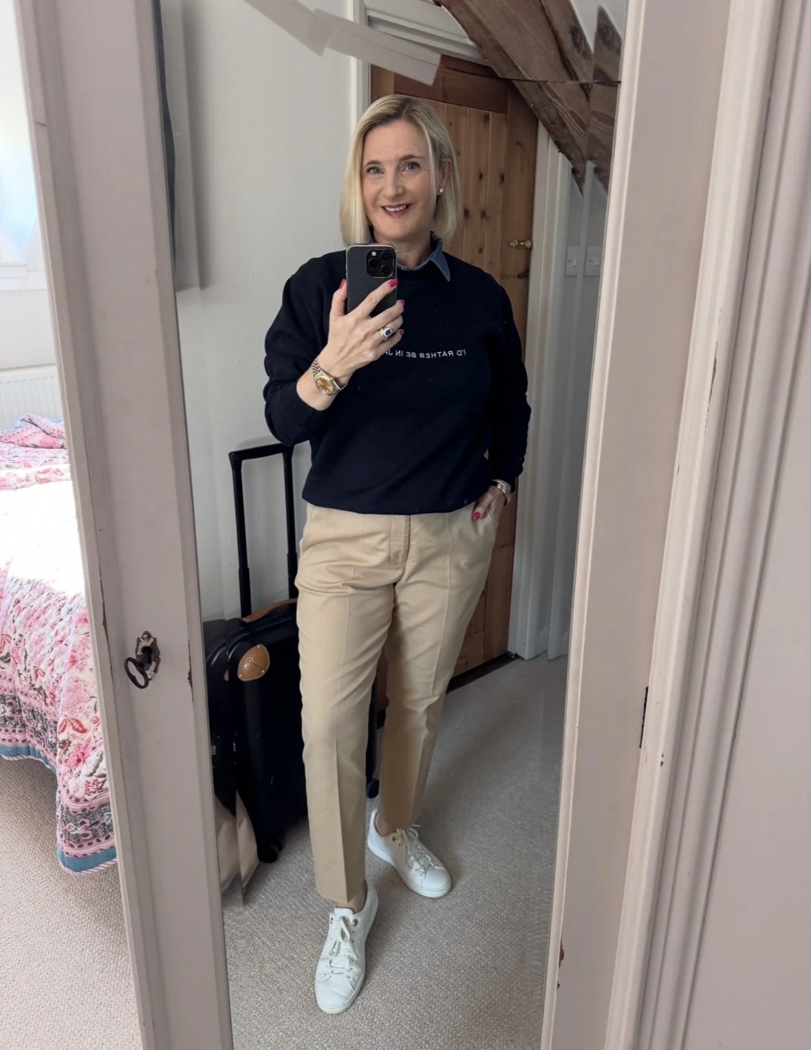 Top from Ralph Lauren (children’s wear, this one is child’s medium. Give the kids wear a go in any shop and save the VAT, follow me for more money saving tips 🥴🫣😂). Trousers from M&S, Faux Shirt from Temu.