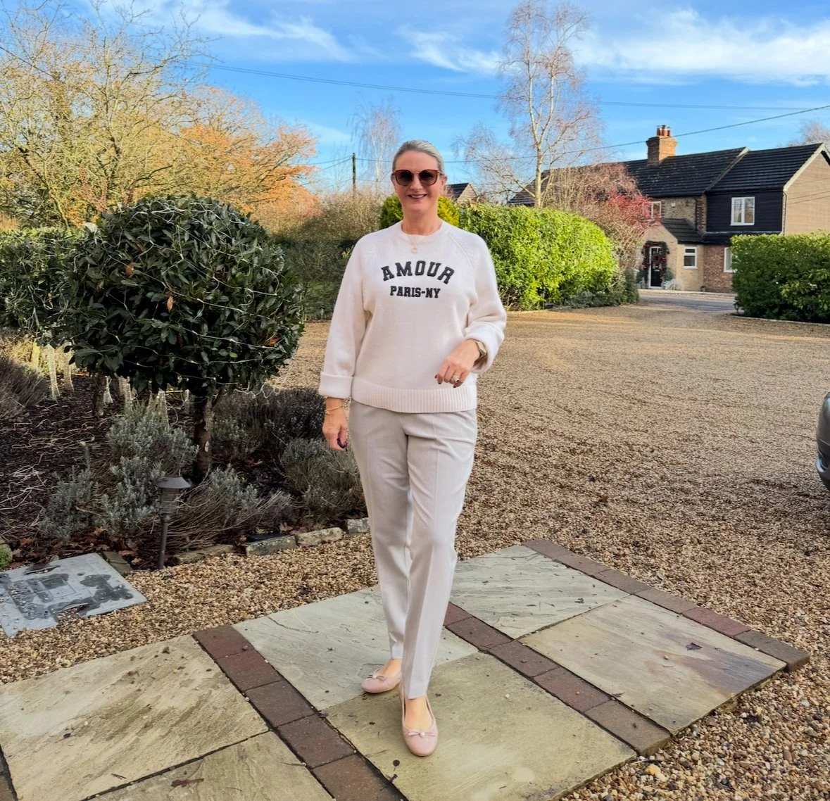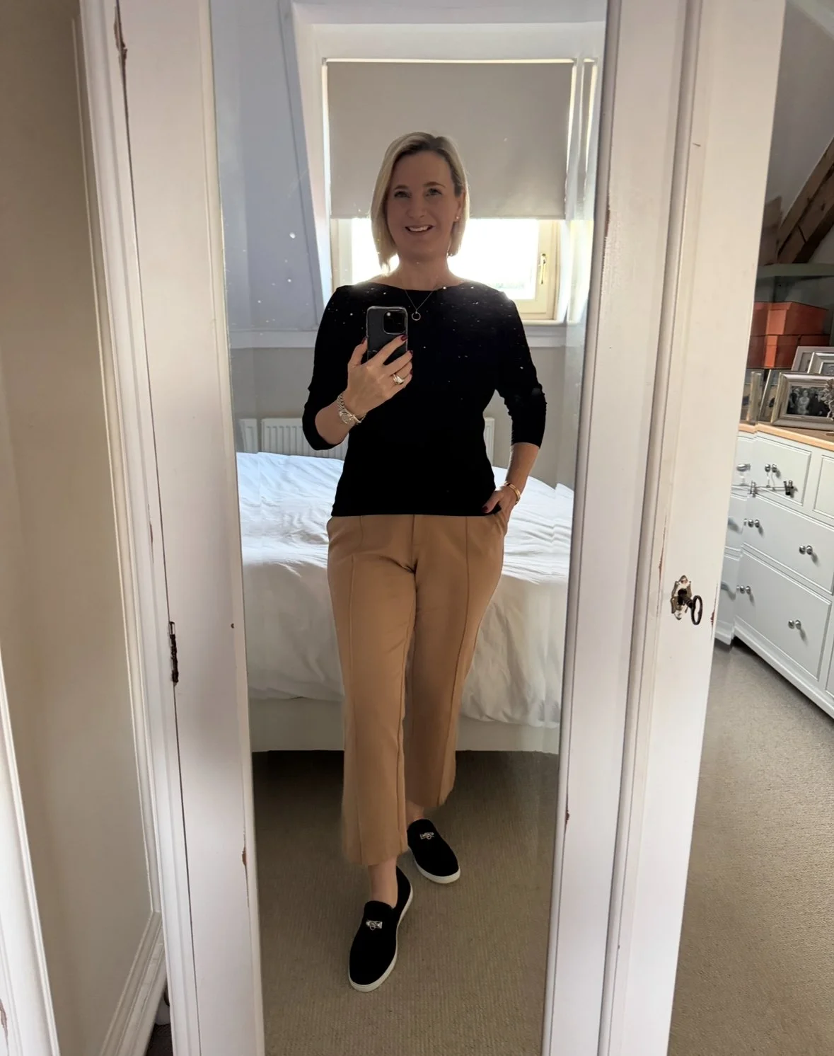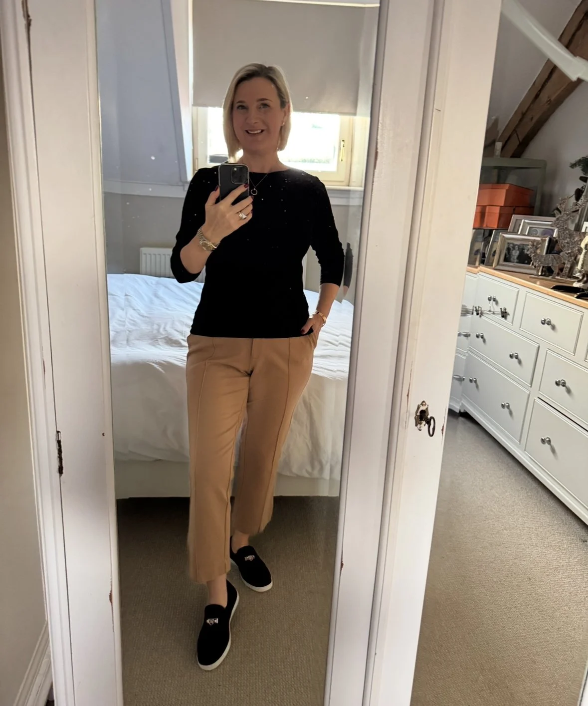 Top from M&S, Trousers from Micheal Kors, Shoes from Hermes.